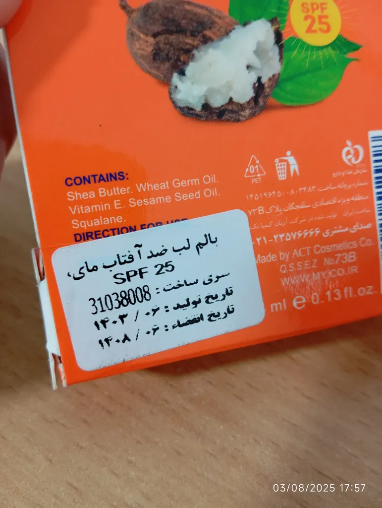 محصول عالی بالم لب My ؛ خیلی بالم لب خوبیه و بوی عالی داره خودش بسته بندی جدا داره و خوشگله ... مقدار زیادی بالم توش هست spf 15 هست. زیر رژ لب هم میشه استفاده کرد. وقتی خریدم رو جعبه تاریخ انقضا 1407 بود