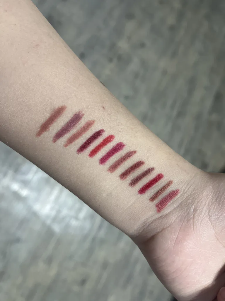 با توجه به سوالات دوستانی که میخان خرید کنن عکس و توضیحاتی میزارم امیدوارم بدردتون بخوره، خیلی خوشرنگن و نرمه هر کدوم شاید اندازه بند انگشته موادش، بصورت ماتیکی استفاده میشه ، زده ضد آبه ولی توی تستی که هم روی دست هم روی لب انجام دادم پاک میشه که البته بهتره و خشک نمیکنه پوست لبو در کل بنظرم توی تخفیف حتما ارزش خرید داره ، یدونش نوکش شکسته بود که خیلی مهم نبود عکس هم از رنگبندی و تست روی دست میزارم برای دوستانی که میخان خرید کنن 🙏🏻