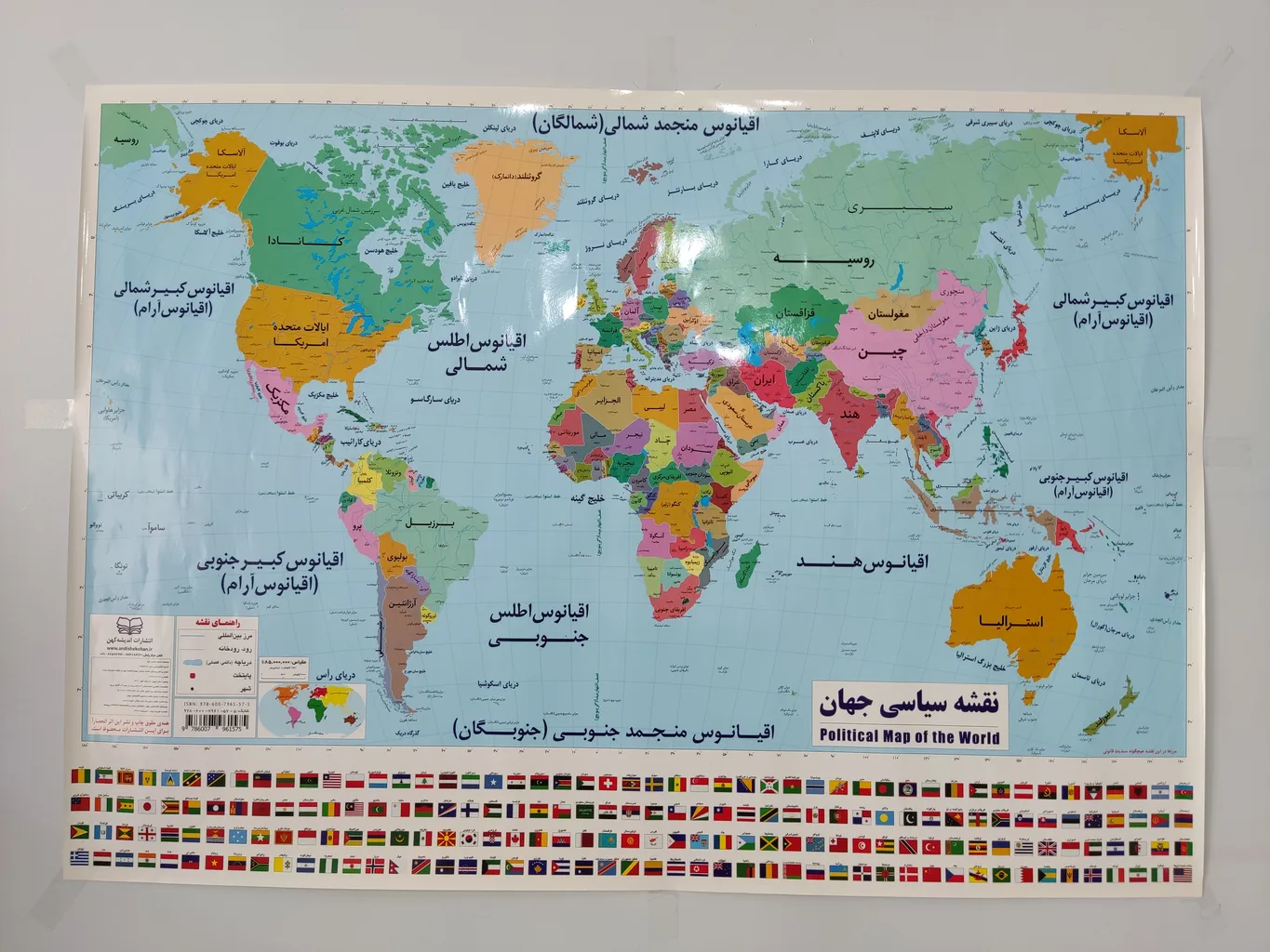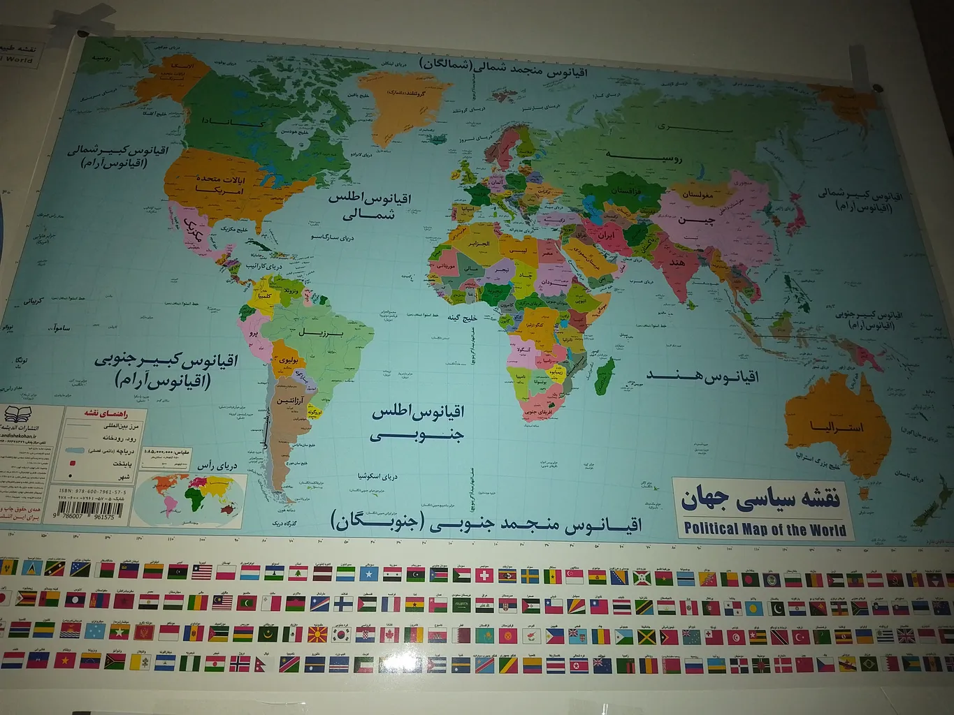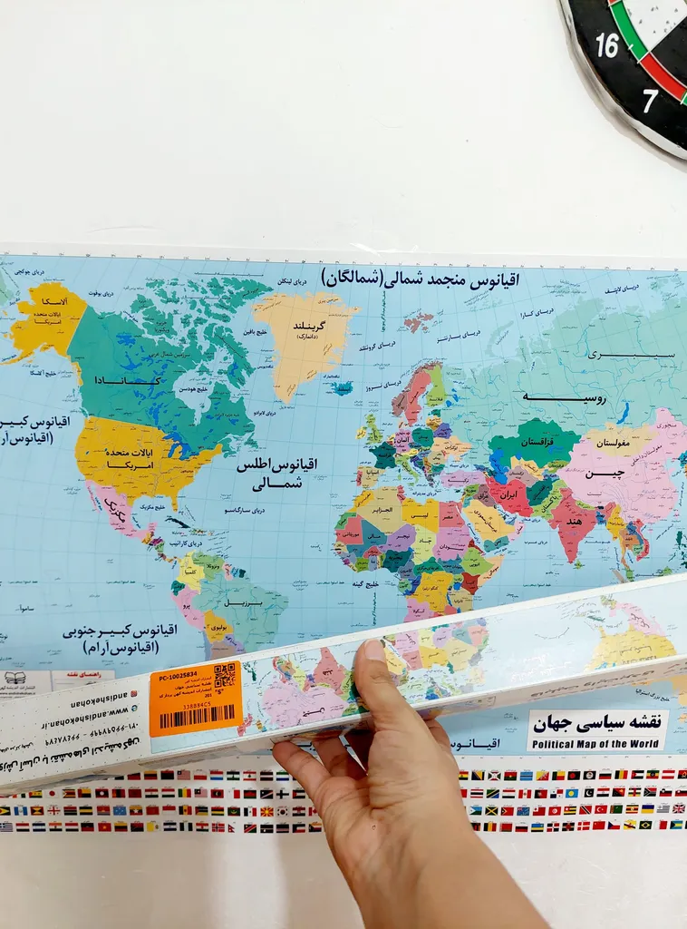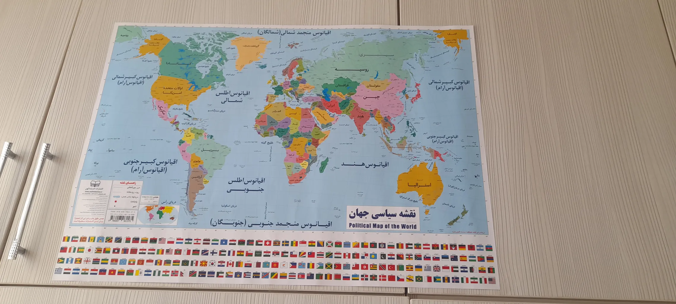 خریدار بدون نام : کاربردی و لازم ؛ امروز به دستم رسید.از زمان تحویل و بسته بندی کاملا راضیم. هیچ چروک، لکه و ناصافی ای روی نقشه وجود نداره.حدود کشور ها و اسم و پرچم هاشون کاملا واضحه و حرفی باقی نمی زاره