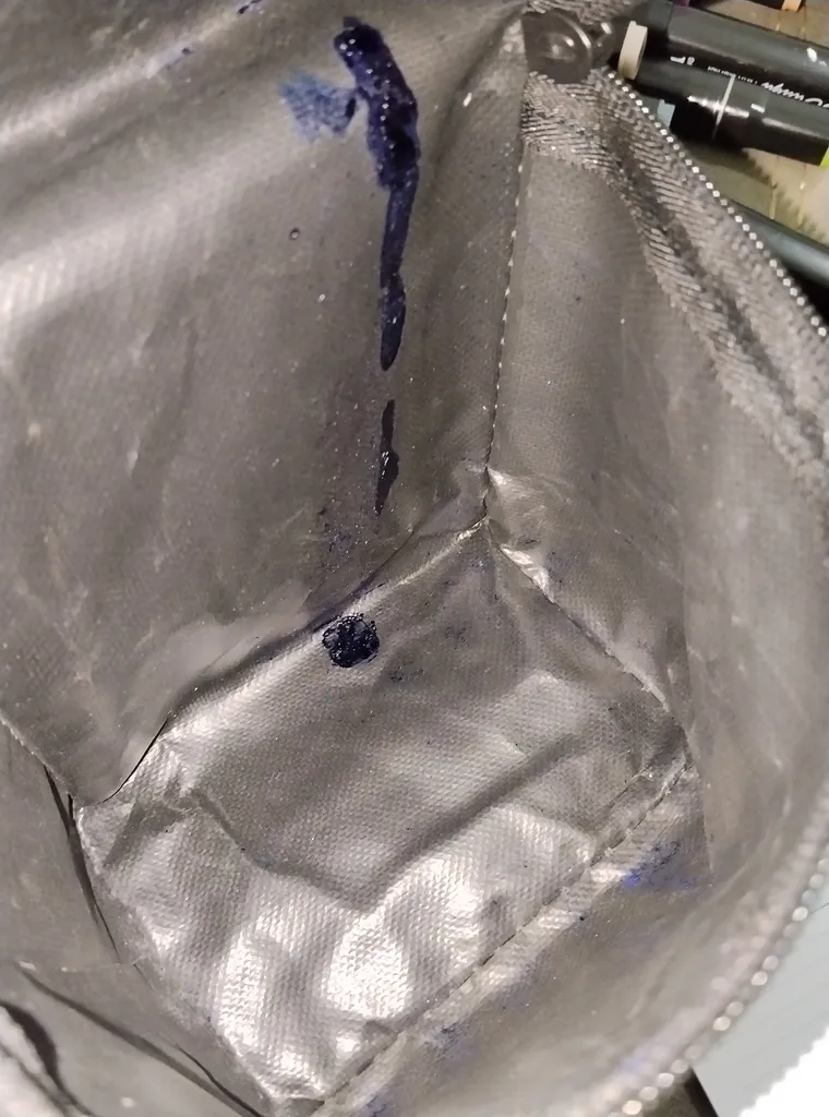 وقتی بسته بعد یک هفته دستم رسید، دوتا از رنگاش کامل خشک بودن و یکی از اون دوتا رنگشون حسابی ریخته بود و کیف و باقی رنگ ها رو کثیف کرده بود و حتی موقع آنباکس فیلم و عکس گرفتم و معلومه که میشه گفت تقریبن خشک شده بودن رنگهای ریخته شده