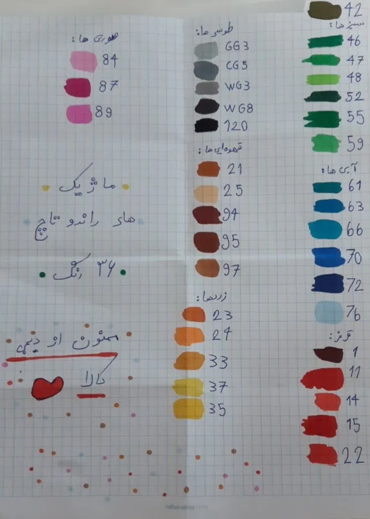 رنگ و پیگمنت مارکر ها خوب و باکیفیت من برای راندو معماری گرفتم، اما دو تا از مارکر ها خشک شدن (شماره22و175) یکیشون که اصلا درش باز شده بود و رنگ CG8 هم درش ترک خورد عکس دو تا مارکر خشک شده رو میذارم، خواهشمندم در ارسال ماژیک ها دقت بفرمائید خیلی حیفه من 60 رنگ سفارش دادم اما الان ماژیکام ناقص شده فقط از 58 تا میتونم استفاده کنم متاسفانه کسی هم پاسخگو نیست