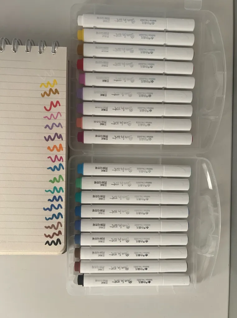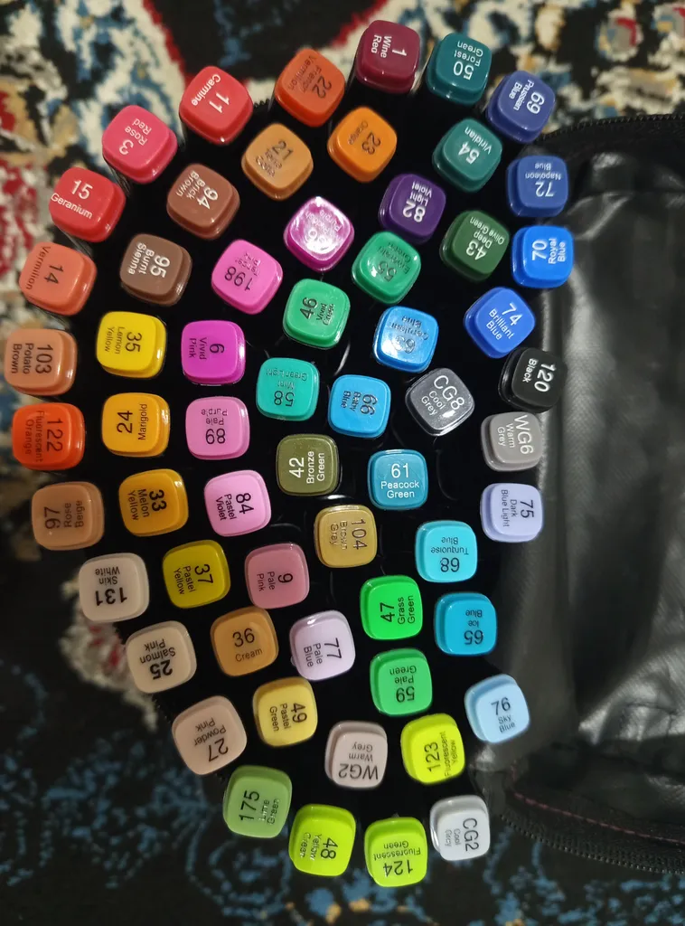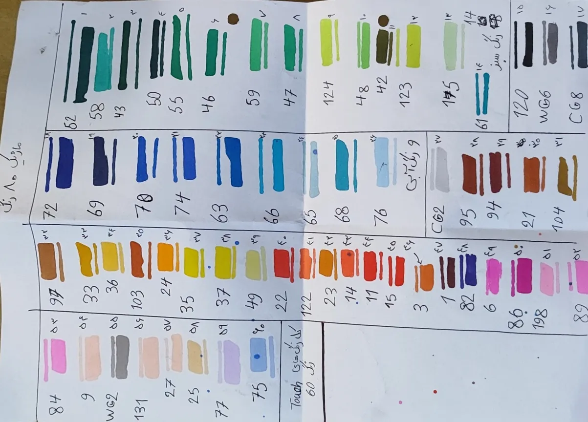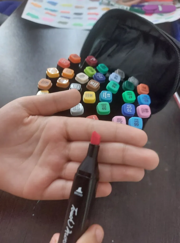همه ماژیکا رنگای خوبی داشتن فقط طیف قرمز برای من نداشت اصلا ولی طیف رنگای خنثی و رنگ سبز ،آبی . زرد ،نارنجی ، صورتی بود و تعداد انگشت شماری از ماژیکا جوهرشون موقع بازکردن در ماژیک یا میپاشید یا مغزیش در میومد،برای استفاده حرفه ای توصیه نمیشه چون رنگش کمی پخش میشه،انگار داری با آبرنگ کار میکنی،دربشم اصلا راحت باز نمیشه،ولی در کل خوبه ،راضیم