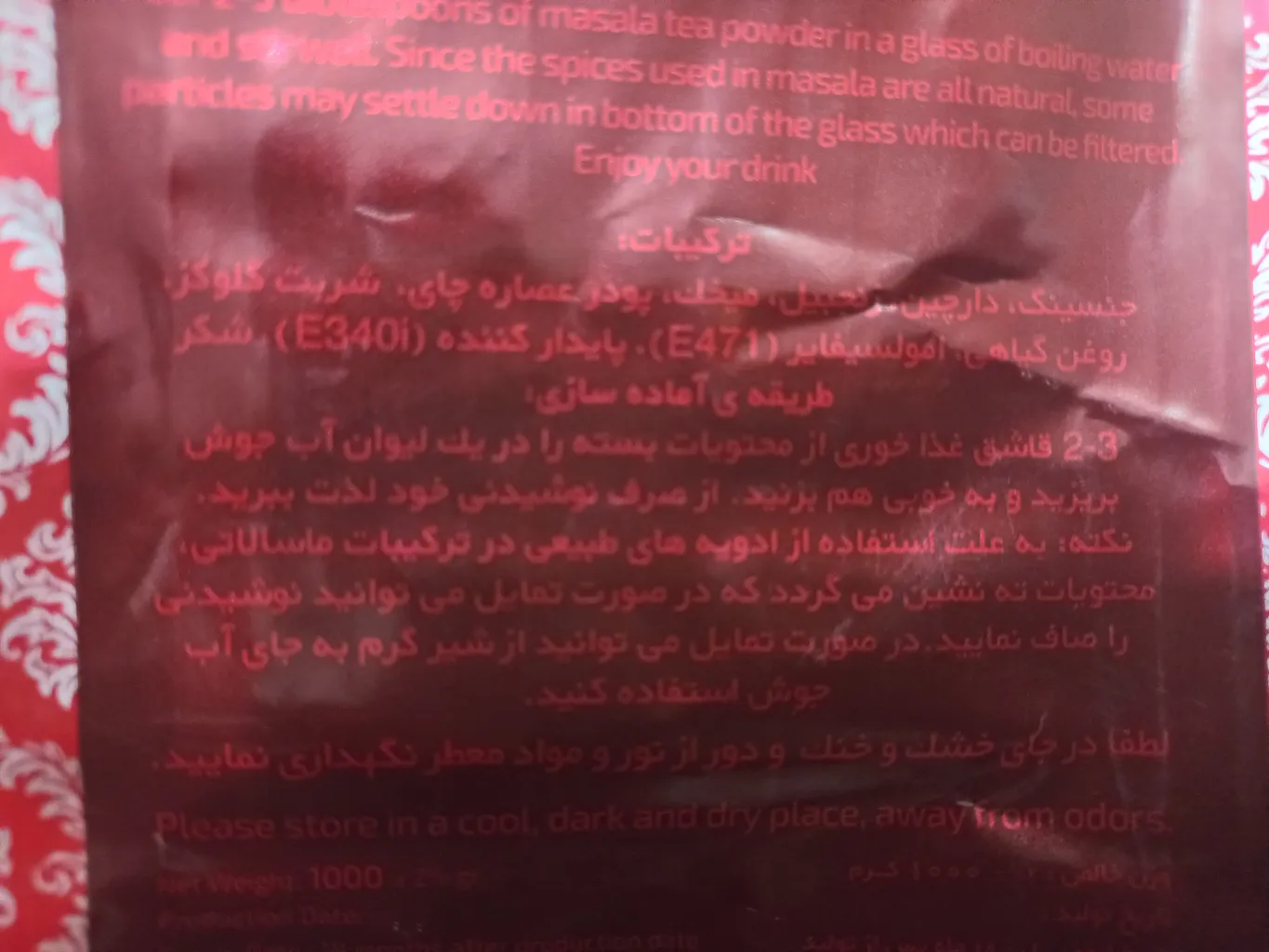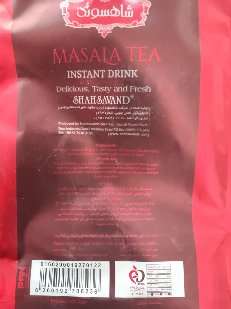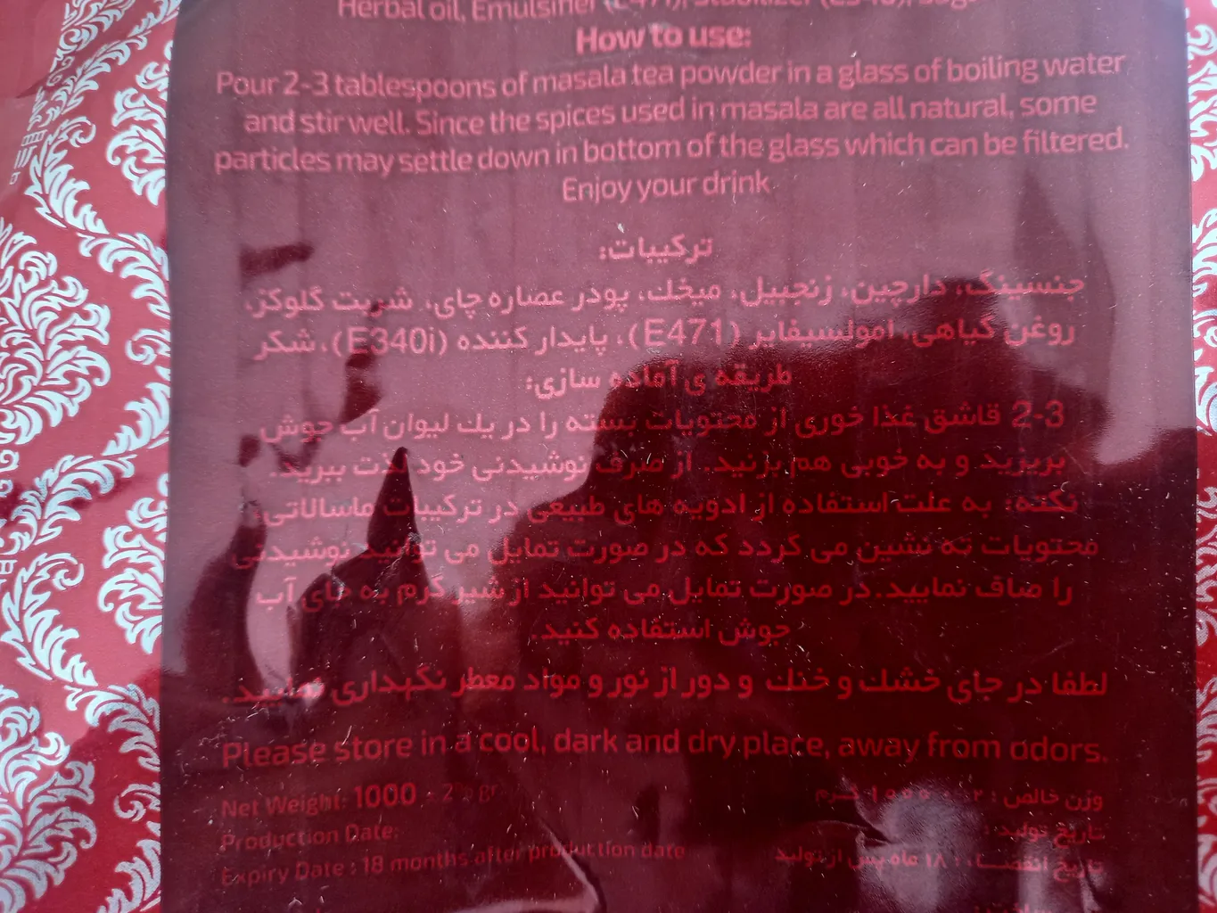 احمد قیاسوند حاجی آبادی : اصلا از طعم و مزه راضی نبودم. طعم آب میده با یه مقدار هل، قبلا چای ماسالا فله استفاده کرده بودم خیلی عالی بود. عکس ترکیبات و گذاشتم خودتون قضاوت کنید.