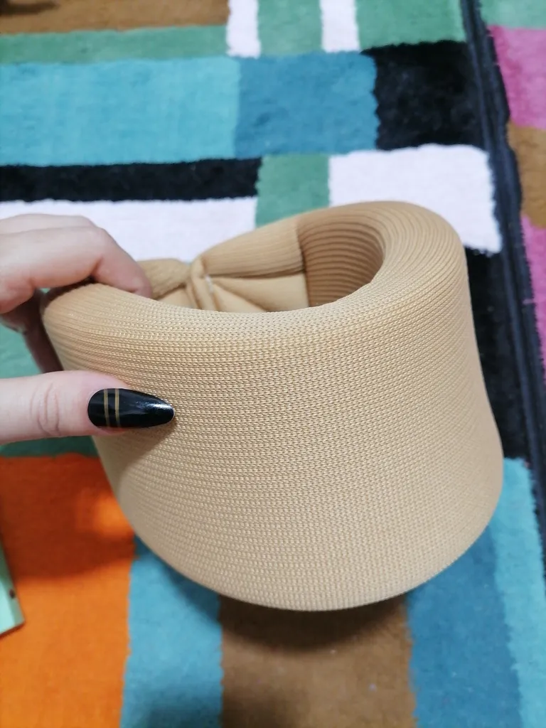 مژگان حسینی : خیلی بزرگه. اصلا استاندارد نیست. یکی سفارش دادم سایز L، خیلی خیلی بزرگ بود. هیچ آدمیزادی نمیتونه چنین گردنی داشته باشه. عکس گذاشتم، مگر گردن آدم اندازه یه کوسن مبل باشه. تازه یه سایز بزرگتر هم بود. اینبار کوچکترین سایز یعنی S گرفتم، بازم قابل استفاده نیست