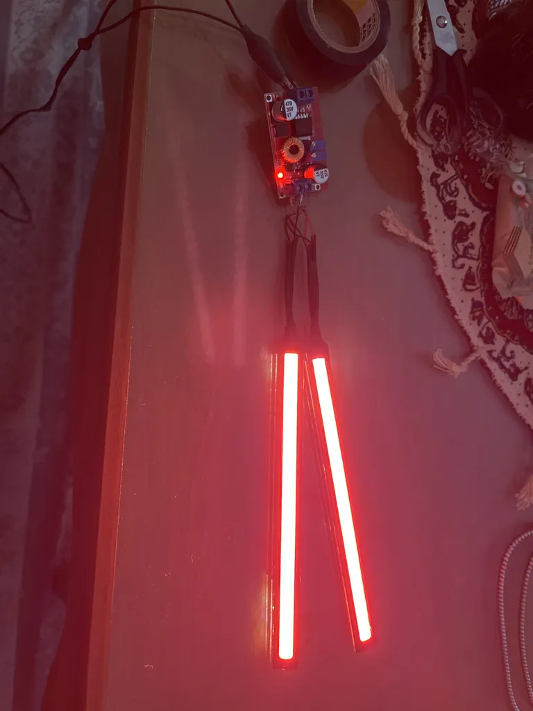 حمید هنرجو : سلام وقتتون بخیر و نیکی ، چون نورش سفید یخی بود ، و من برای پشت موتور میخواستم استفاده کنم ، یک تلق قرمز رنگ رو سه لایه بریدم و با چسب چسبوندم ، و چون باید برق مصرفی اش ، باید تثبیت شده باشه یک ماژول هم سر راهش قرار دادم