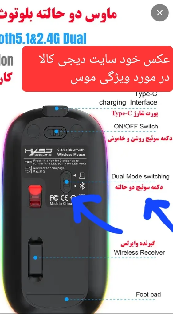 - ⬤ نورپردازی RGB : زیبایی و جذابیت نورپردازی RGB در ماوسها برای برخی خریداران مهم است. آنها از ماوسهایی که دارای نورپردازی قابل تنظیم و زیبا هستند، رضایت داشتهاند. این نورپردازی نه تنها به جذابیت ظاهری ماوس افزوده، بلکه میتواند به کاربران کمک کند تا در محیطهای کمنور نیز به راحتی از ماوس استفاده کنند.