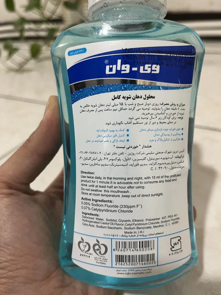 ارشیا خدیوی : دهان شویه وی وان ؛ طعم ملایم و خوبی داشت. هان رو نمیسوزونه و اذیت نمیکنه خرید این محصول رو به دوستان توصیه میکنم من که خوشم امد و راضی بودم، فقط در حد خیلی کم یه مقدار ازش خارج شده بود که بخاطر بسته بندی به وسایل دیگه پس نداده بود باتشکر از دیجیکالا