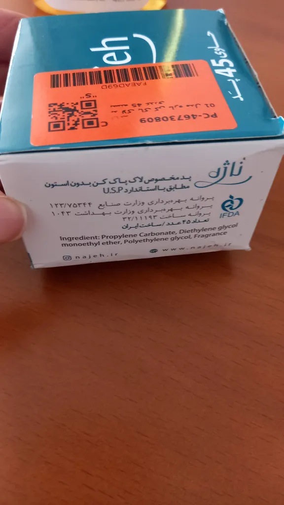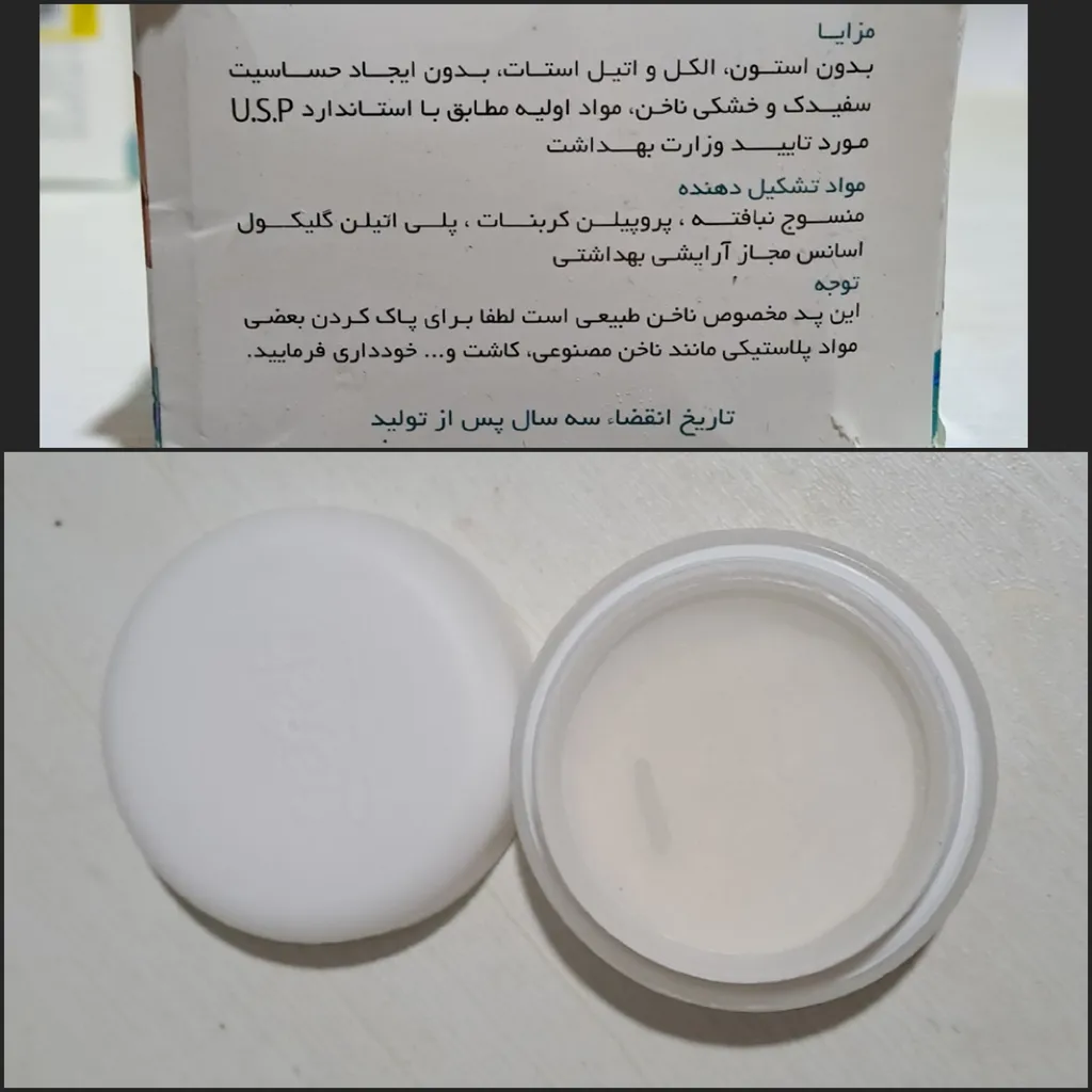 خریدار بدون نام : لاک پاک کن خوب ؛ قبلا داشتم از همین مارک امیدوارم مث قبل خوب باشه هنوز استفاده نکردم، نگران خشک شدن پدها بودم ولی دیدم در ظرف پیچی هست و اینکه داخل ظرف یه در پلاستیکی دیگه داره که اونم مانع از خشک شدن پدها میشه، عکسشو گذاشتم