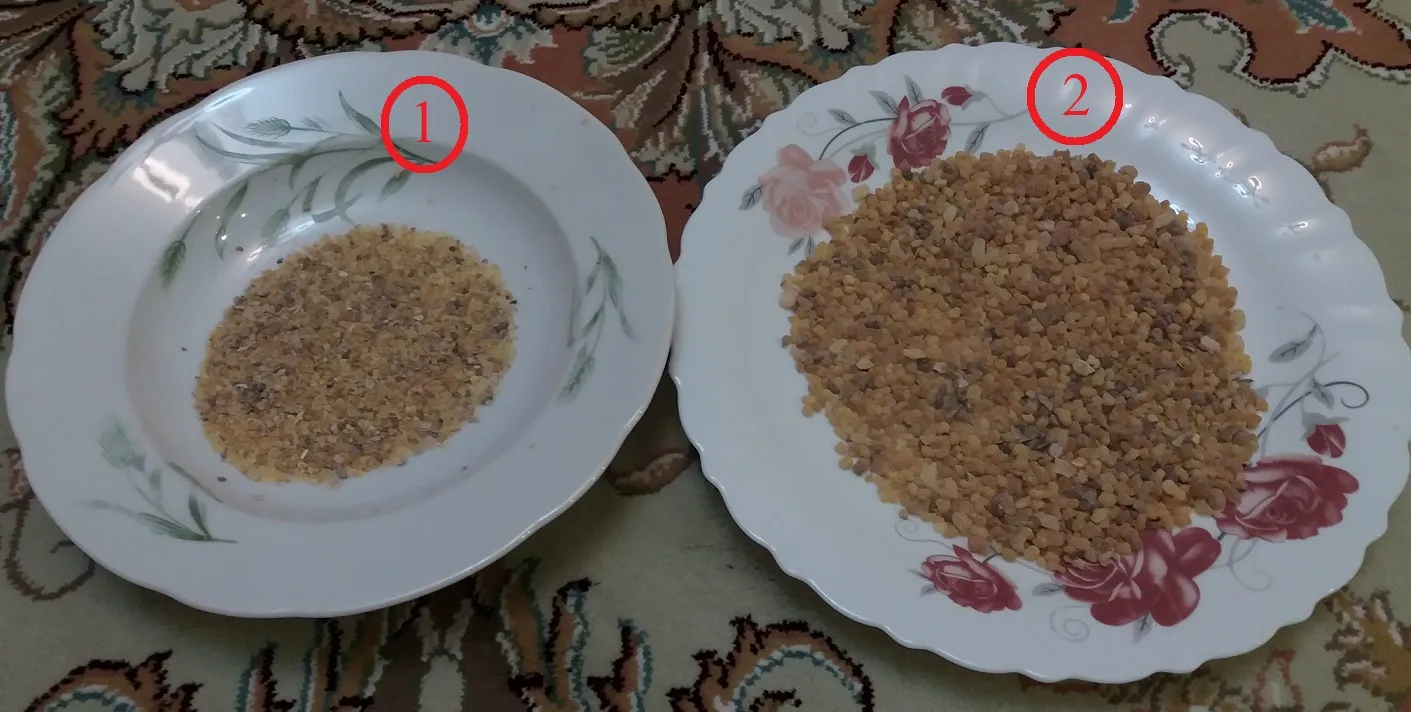 کندری که ارسال کردند خیلی ریز بودش. من یک عکس ارسال کردم، توی عکس کندرهای ریز و درشت را تا حد امکان جدا کرد. شماره 1 در عکس اندازه اش از ارزن هم کوچکتر است و شماره 2 کندرها تقریبا اندازه عدس هستند.