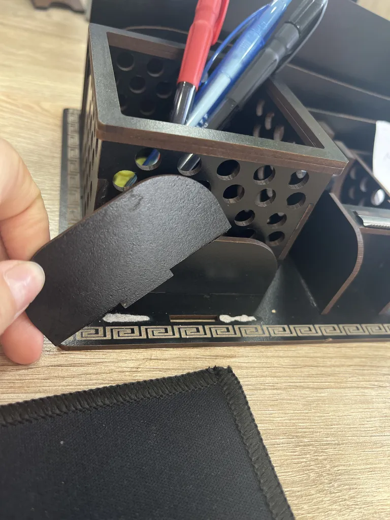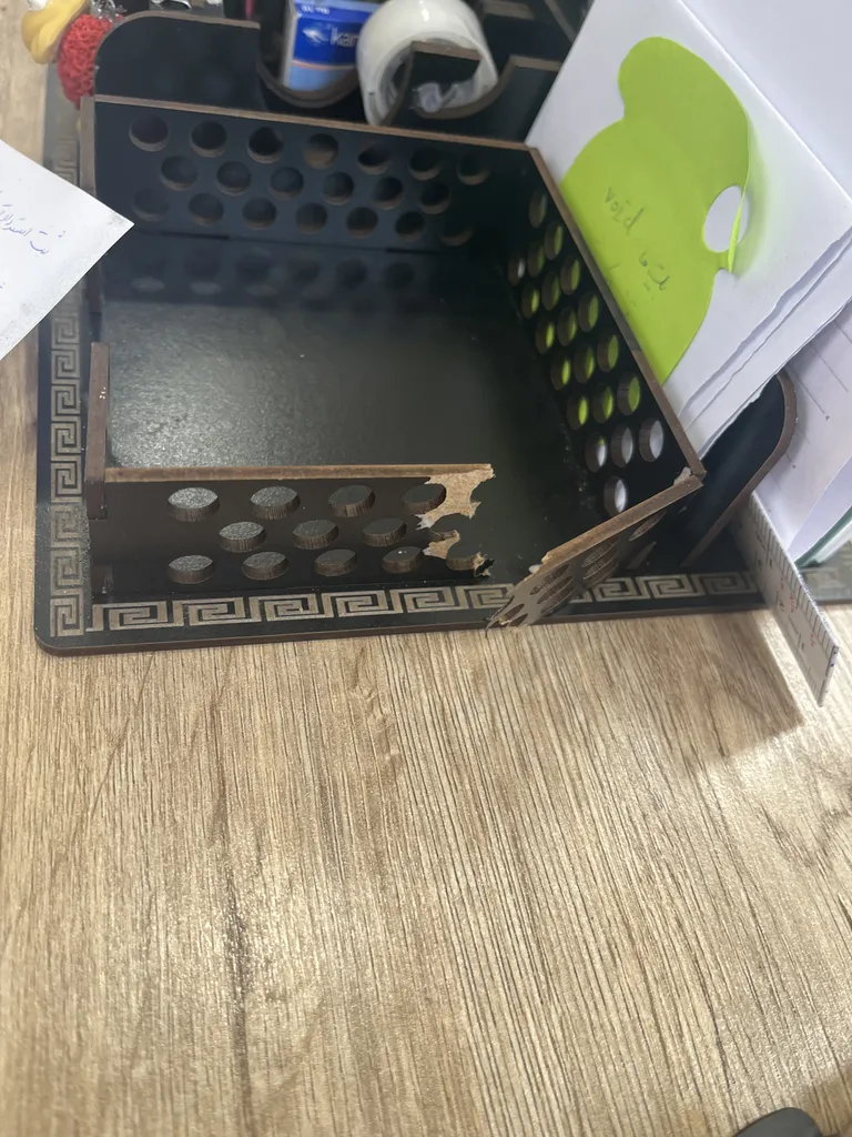 دیدگاه در مورد ست کامل اداری ؛ از همه نظر خیلی خوب بود فقط همانطور که عرض کردم اگر جای چسب نواری کوچک هم داشت بهتر بود و ضمنا مقداری جای خودکار و قلمی زیرش ترک داشت که احتمالا در پست شده ولی با چسب ۱۲۳ چشب زدم و مقداری رنگ زدم درست شد