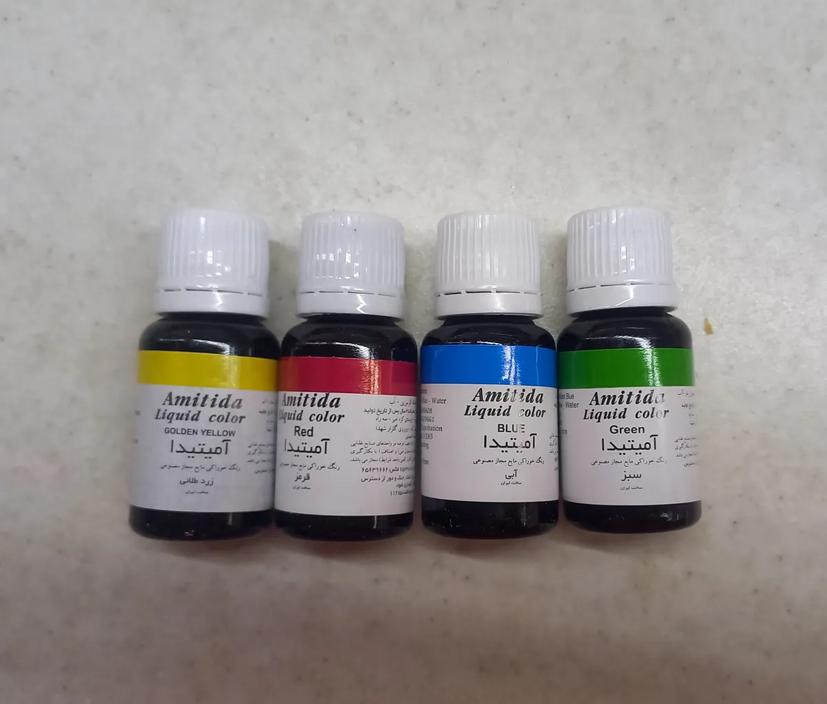 نظر و تجربه خرید رنگ خوراکی قرمز و سبز و آبی و زرد طلایی آمیتیدا - 200 گرم بسته 4 عددیدر تاریخ ۱۶ مرداد ۱۴۰۳