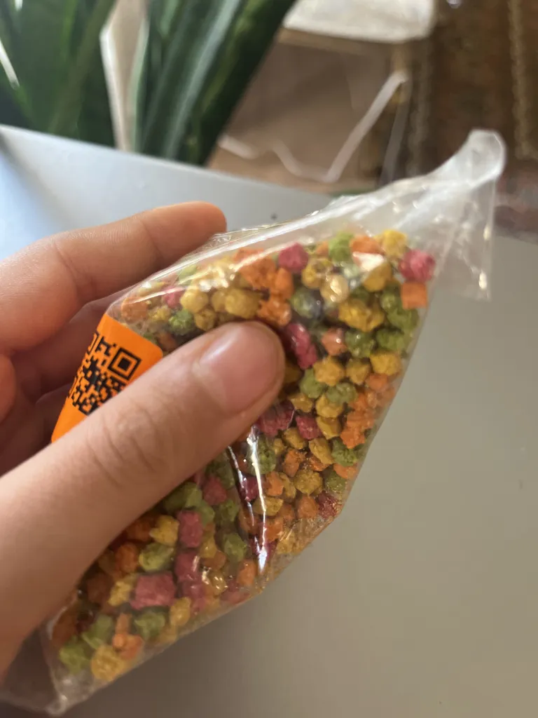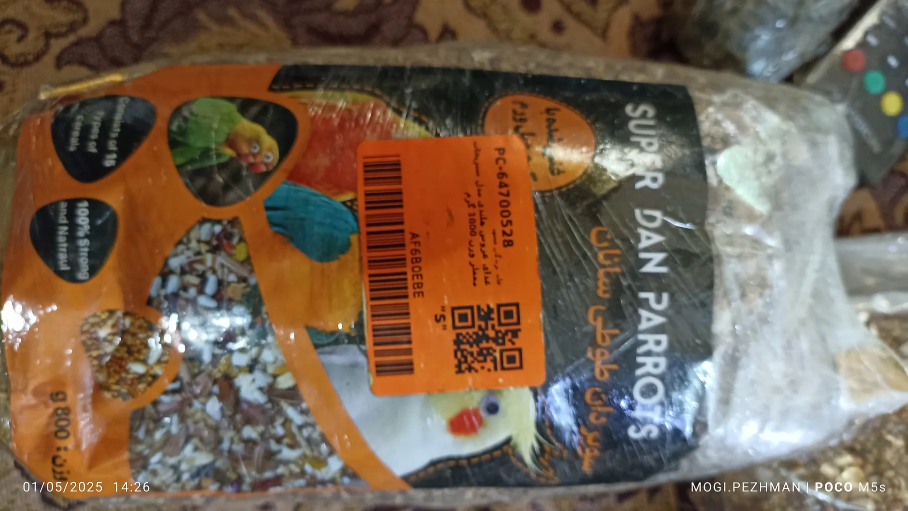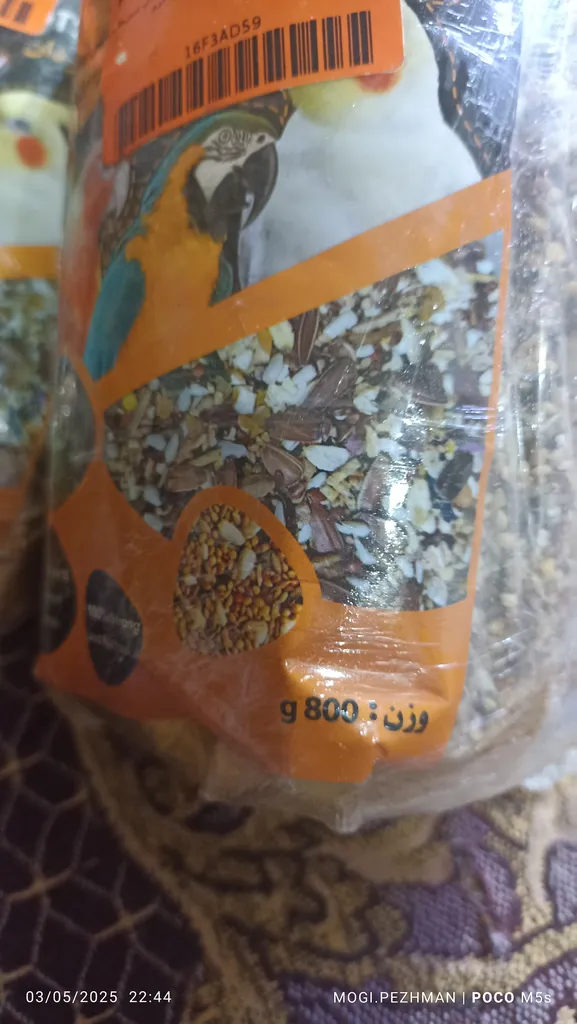 و زیرش نوشته ساخت ایران،،ننوشته محتویاتش چیه فقط نوشته گرفته شده از پروتئین گیاهی. عروس ما نخورد فقط همون ارزن ها رو میخوره و تخمه ها رو نمیخوره و بعضی دونه هاش خیلی سفته و اصلا نمیتونه بخوره و فقط پرتشون میکنه ،به هر حال به درد عروسمون نخورد.تاریخ انقضاشم که رو ی تیکه کاغذ نوشتن و چسبوندن روش