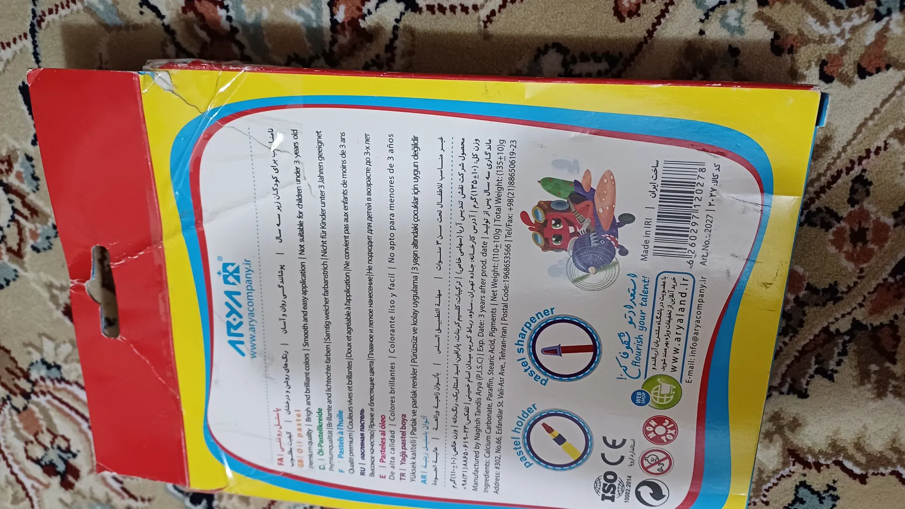 R Mohammadirad : پاستل آریا ؛ پاستل بوی لوازم آرایش تاریخ گذشته میده. نمیدونم این بوی خود پاستله یا خراب شده! تاریخ انقضا سه سال پس از تولیده ولی تاریخ تولید روی بسته ثبت نشده. ظاهر و رنگش خوبه و روی کاغذ مشکلی نداره. من برای خودم تهیه کردم و با این قیمت خوبه ولی برای بچه توصیه نمیکنم