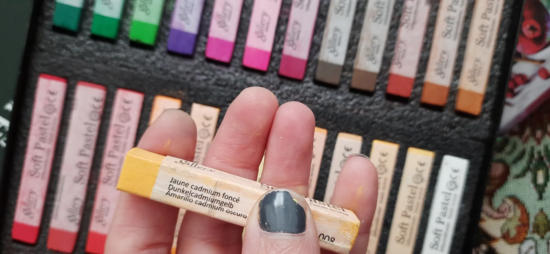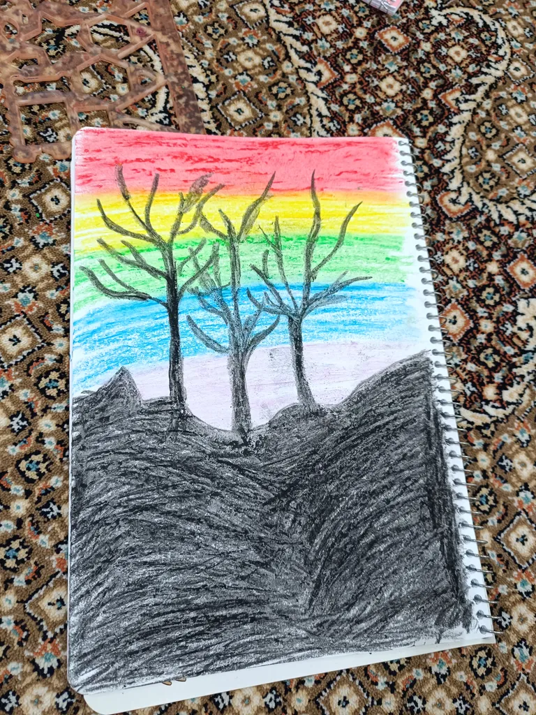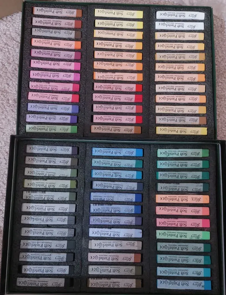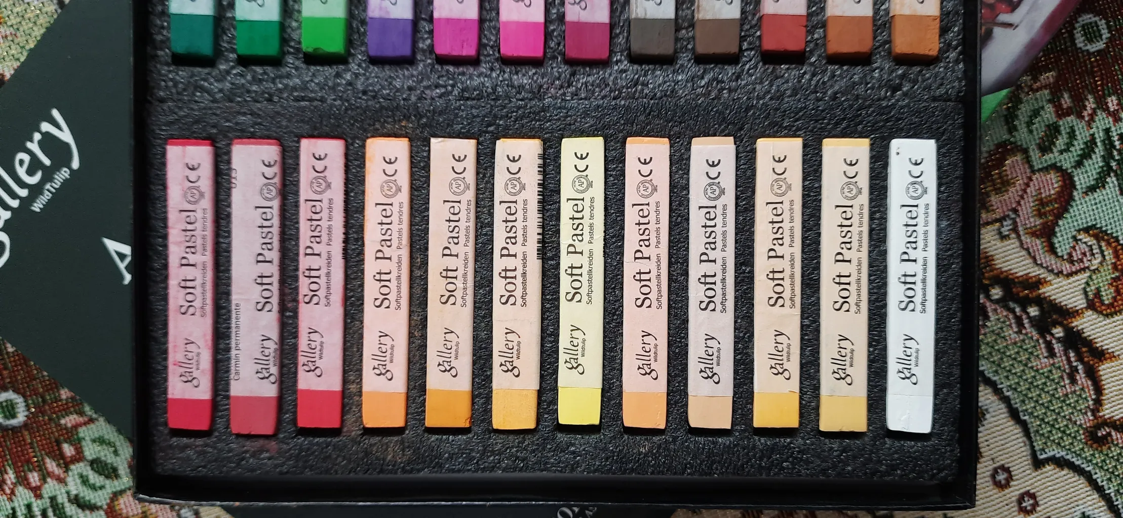 رنگ و متریال خوب ؛ هر پاستل اندازه خوبی داره و به دست گرفتنش رو آسون میکنه. و من مقوای تیره مخصوص آبرنگ استفاده کردم و با پاستلهای روشن روی زمینه تیره نقاشی کردم که عکسش رو میذارم تا کیفیت رنگها مشخص بشه