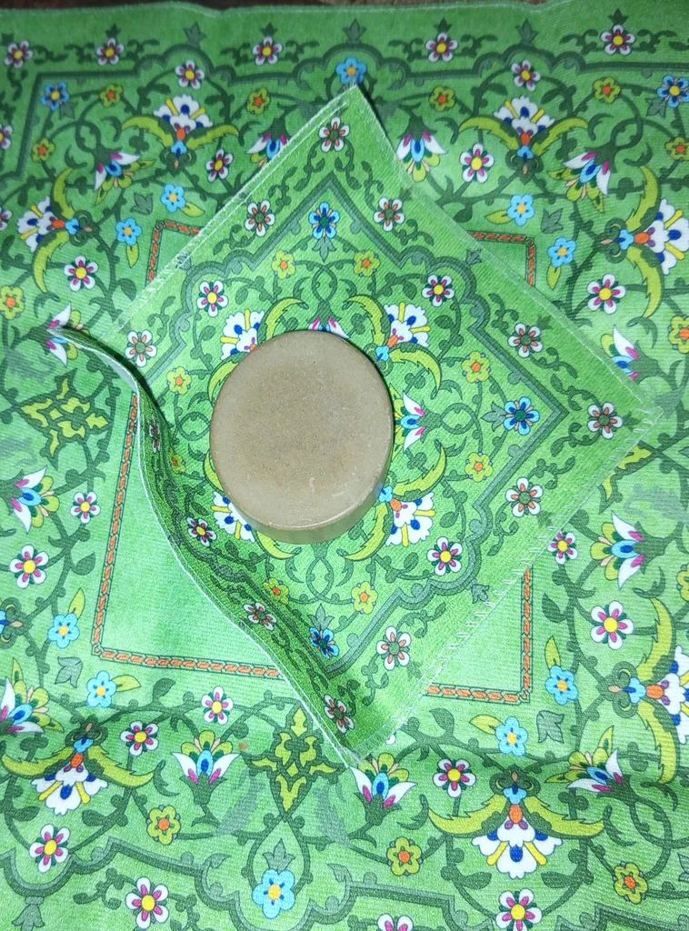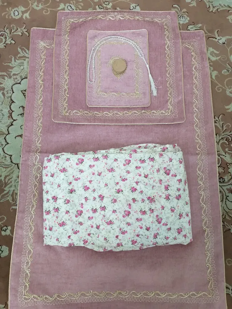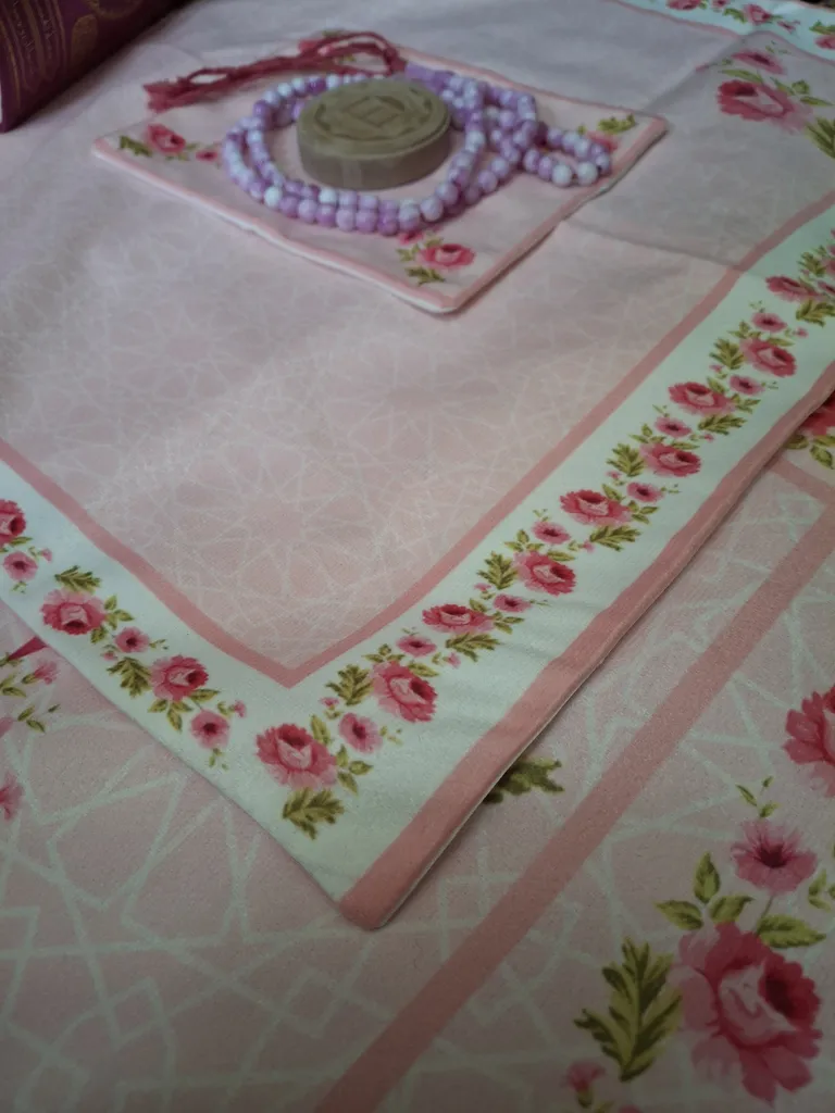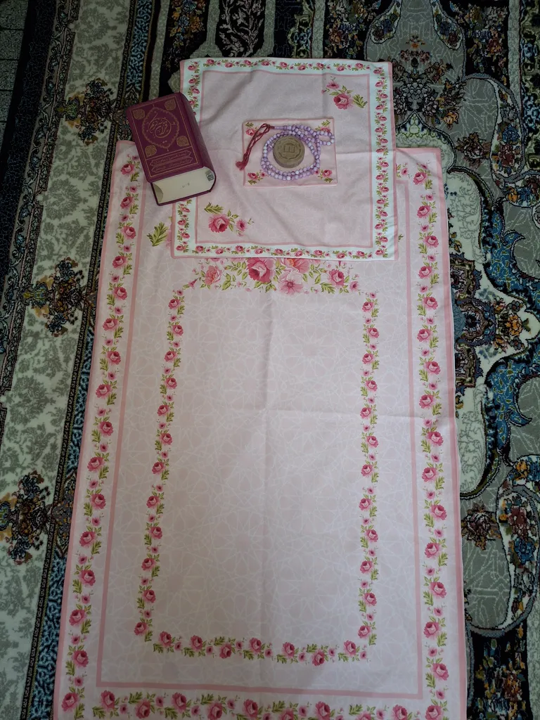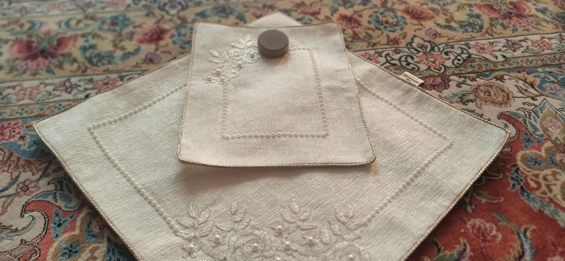 خیلی کوچولو و با نمکه جنس چرمش که مصنوعیه خوب و نرمه و مُهرش خیلی با مزست. برای سفر و بیرون رفتن خیلی خوبه به نظرم ولی برای خونه من ترجیح میدم یک جا نماز یا سجاده ی بزرگتری باشه