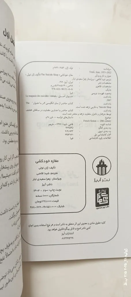 مریم ضامنی : کتاب مغازه خودکشی ؛ سایزش یکم کوچیکه ولی خب برای داستان خوبه برگه هاش یه مدل کاغذ کاهی هستن که من بخاطر سبک بودنش دوست دارم تو تخفیف خریدم و با کتاب خواهرم که همینه ولی از یه انتشارات دیگه مقایسه کردم گفت این ترجمه اش بهتره ولی قطر کتاب کمتره و تعداد صفحاتش یه چندتایی کمتره که شاید بخاطر فونتش باشه
