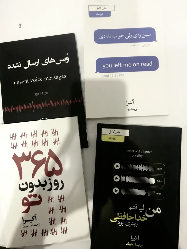 نظر و تجربه خرید مجموعه کتاب 365 روز بدون تو، سین زدی ولی جواب ندادی ، من لیاقتم خداحافظی بهتری بودم و ویس های ارسال نشده اثر آکرا ترجمه پریسا رجوند نشر آیین محمود چهار جلدیدر تاریخ ۳۱ شهریور ۱۴۰۴