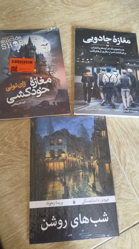 مریم ضامنی : کتاب مغازه خودکشی ؛ سایزش یکم کوچیکه ولی خب برای داستان خوبه برگه هاش یه مدل کاغذ کاهی هستن که من بخاطر سبک بودنش دوست دارم تو تخفیف خریدم و با کتاب خواهرم که همینه ولی از یه انتشارات دیگه مقایسه کردم گفت این ترجمه اش بهتره ولی قطر کتاب کمتره و تعداد صفحاتش یه چندتایی کمتره که شاید بخاطر فونتش باشه