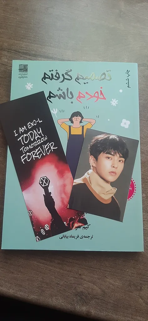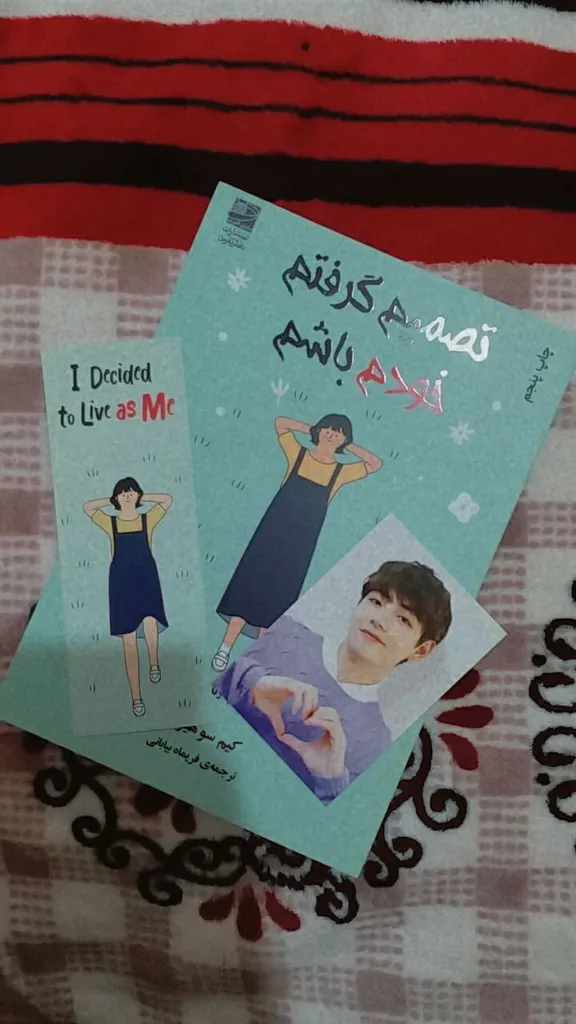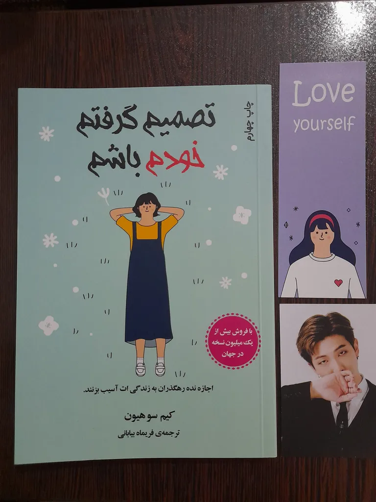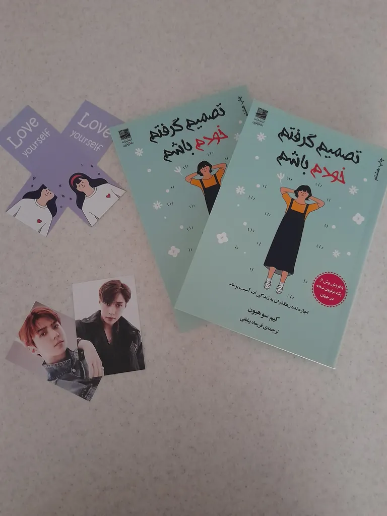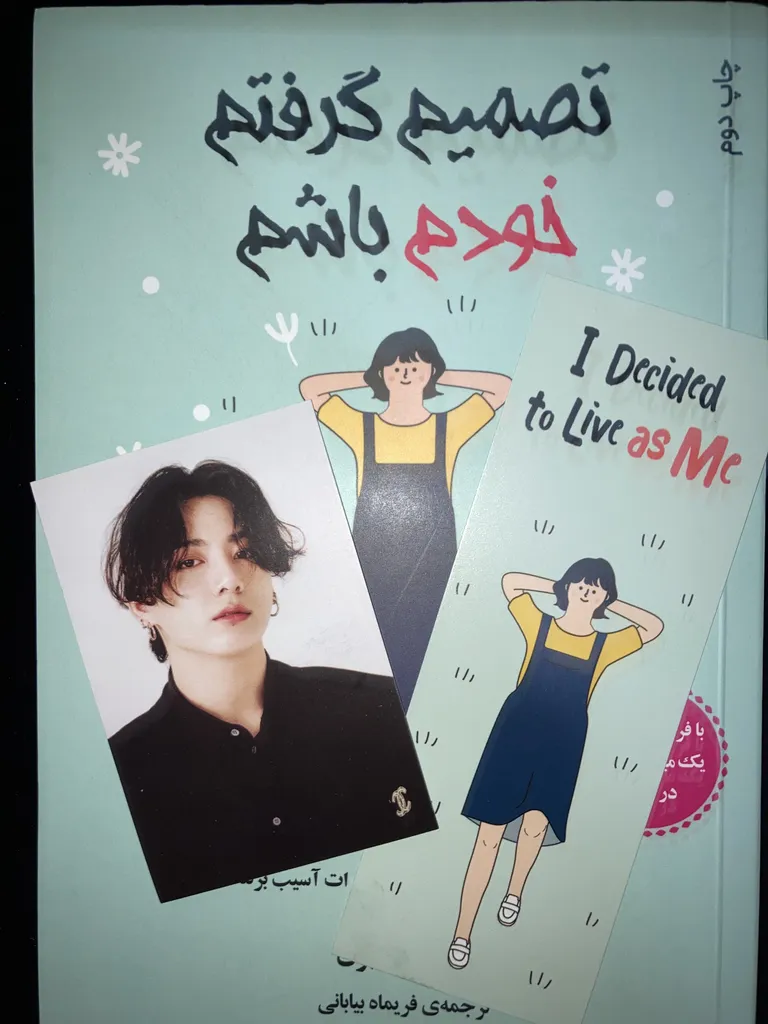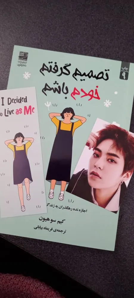 کتاب تصمیم گرفتم خودم باشم^^ ؛ این کتاب از نویسنده کیم سو هیون است که با یک بوکمارک و فتوکارت جیهوپ از گروه بی تی اس به عنوان اشانتیون از فروشگاه انتشارات دانش آفرین خریدم.^^