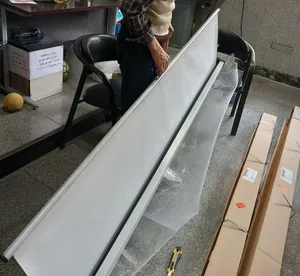 پرده کامل جمع نمیشه ؛ کیفیت صفحه نمایش خوب هست و مشکلی بهش وارد نیست ولی موتورش خیلی ضعیفه و فکر میکنم که صفحه گیر میکنه و کامل نمتونه جمعش کنه .مشکل دیگشم اینه که برای حد آخرش هیچ سنسوری نداره و اگر دکمه رو بزنید مه باز بشه و برید یه دوری بزنید بیاد ( چون تقریبا ۲ دقیقه طول میکشه کامل باز بشه ) میبینید پرده رو تا آخرش باز کرده و داره زور میزنه که قرقرشو هم بندازه بیرون ! ینی استوپی نداره میره تا جایی که زور بیاد رو موتورش .کاتالوگم نداره ریموت هم کار نمیکنه که شاید بخاطر باطریش باشه باید برم بگیرم چک کنم . متاسفانه با مکافات نسب کردیم و خوشحال شدیم کارتونشو انداختیم دور الان نمتونم مرجوعش کنم وگرنه قطعا این کازو میکردم