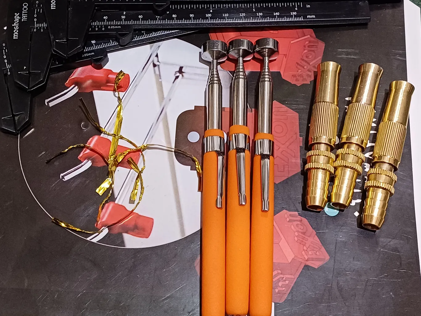اینا امروز به دستم رسید. برای اینکه نسبت به ابعاد آهن ربا دید بهتری داشته باشید کنار خودکار گذاشتم تا خودتون متوجه ابعاد آهن ربا بشید. یه دونه رو تکی گذاشتم و فاصله اون تا بقیه آهن رباها یه جوری تنظیم شده که جذبشون نشه یعنی اگه اون آهن ربای تکی رو یکم نزدیک تر کنم جذب بقیه میشه