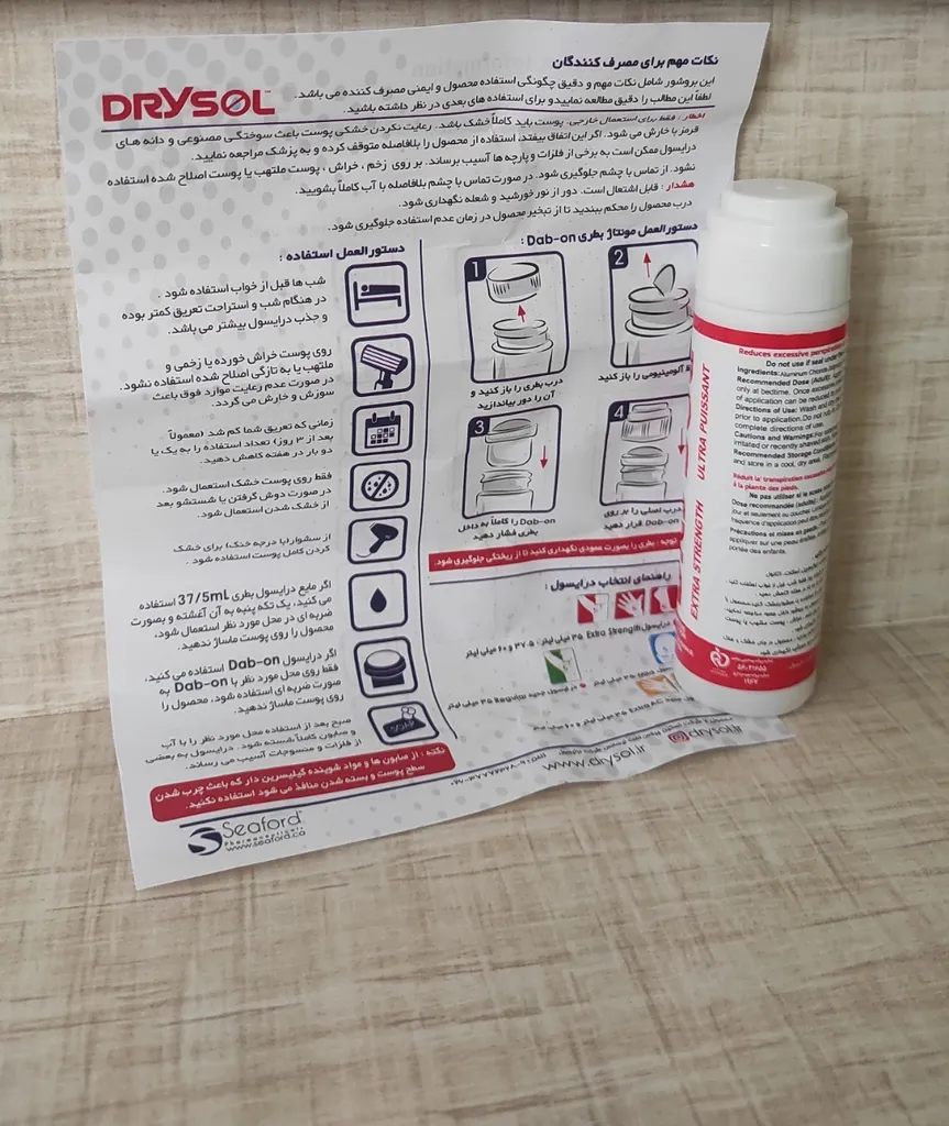 ضد تعریق درایسول مدل Extra ؛ خوب من تعریق بیش از حد کف دست و پا دارم (هایپرهیدروزیس ) فعلا اولین شبی بود که استفاده کردم و حدود ۶۰ درصد تعریق کمتر شده و به نظرم این عالیه واسه اولین بار و زیربغل هم حدود ۱۰۰ درصد تعریق کم شده و تقریبا دیگه اصله امروز عرق نکرم و فقط با یکبار استفاده واسه زیر بغل فوق العادس
