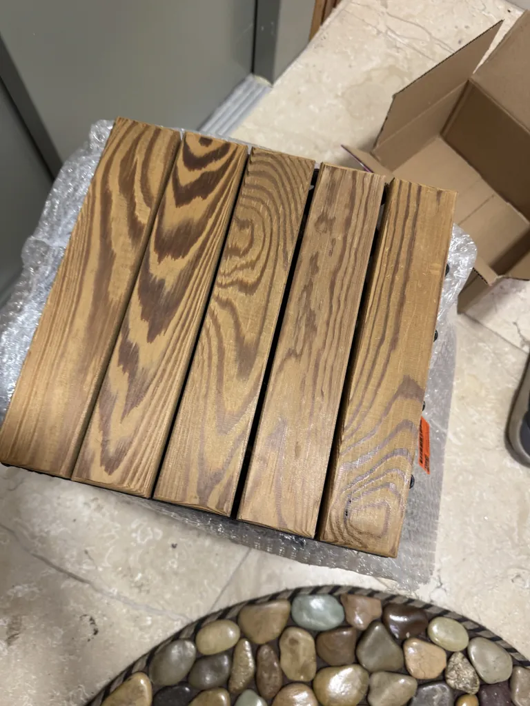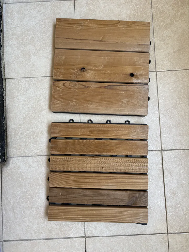 sara hasanvand : از سه بسته ارسالی که شامل 18 تایل بود 1 تایل چوبش شکسته بود و دومی هم زده داشت سطح چوبش که عکسشو گذاشتم اما بقیش اوکی بود . از چوب خام استفاده شده بود که آسیب پذیر بود و خودم مجبور شدم از جلا چوب ضد آب استفاده کنم و رنگ چوبش براق و زیبا شد . ولی در نهایت چون بالکنم به 16 عدد تایل نیاز داشت مرجوع نکردم