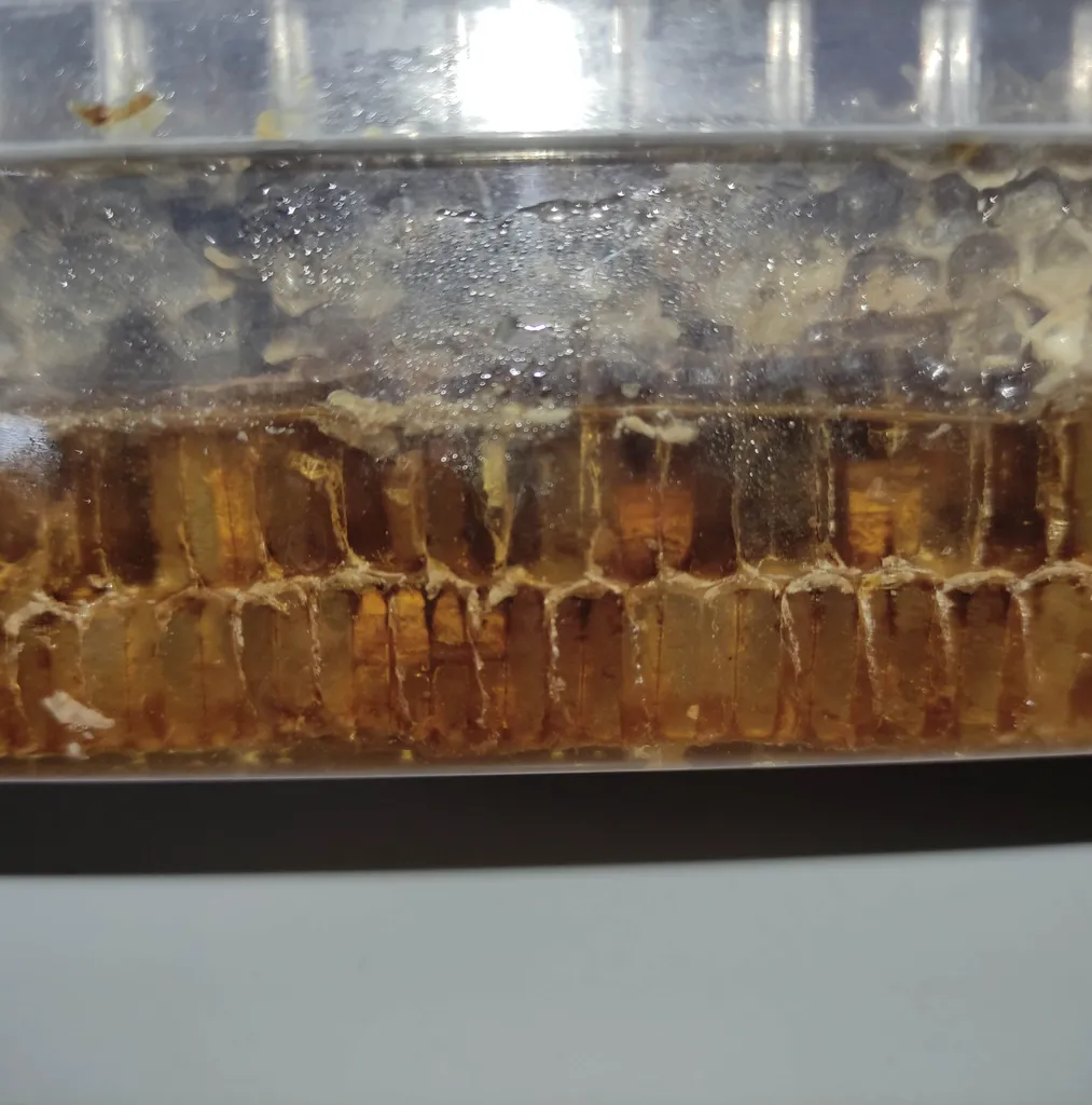 اما خود عسل درشو را که باز کردم عطر وبوی خوبی داشت وکمی از عسل رو خوردم خوشمزه وخوش طعم وعالی بود،قبلا من از عسل های ژیگلاس از فروشگاه میخریدم اون مزه اش خیلی به شیرینی میزنه ولی این عسل طعم ومزه طبیعی داشت ورنگش هم خوبه،رنگش تیره است