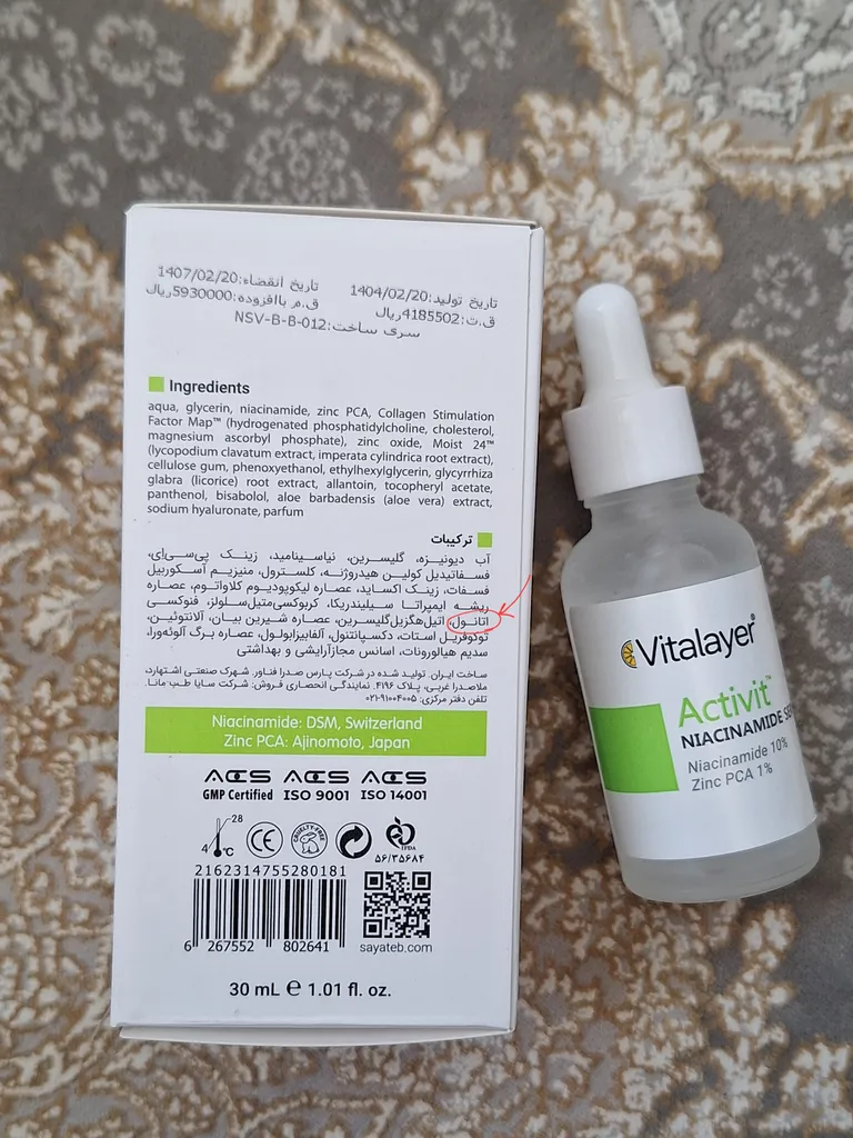 خریدار بدون نام : نسبت به پوست حساس من هنوز حساسیتی ندادم جوش هم نزدم برای نتیجه محصول باید کلش تموم بشه تا بشه نظر بدم تا اینجا راضی ام داخلش نیاسینامید ، ویتامین سی داره ظرفش شیشه ای هست که از مزایای محصوله عکس گذاشتم