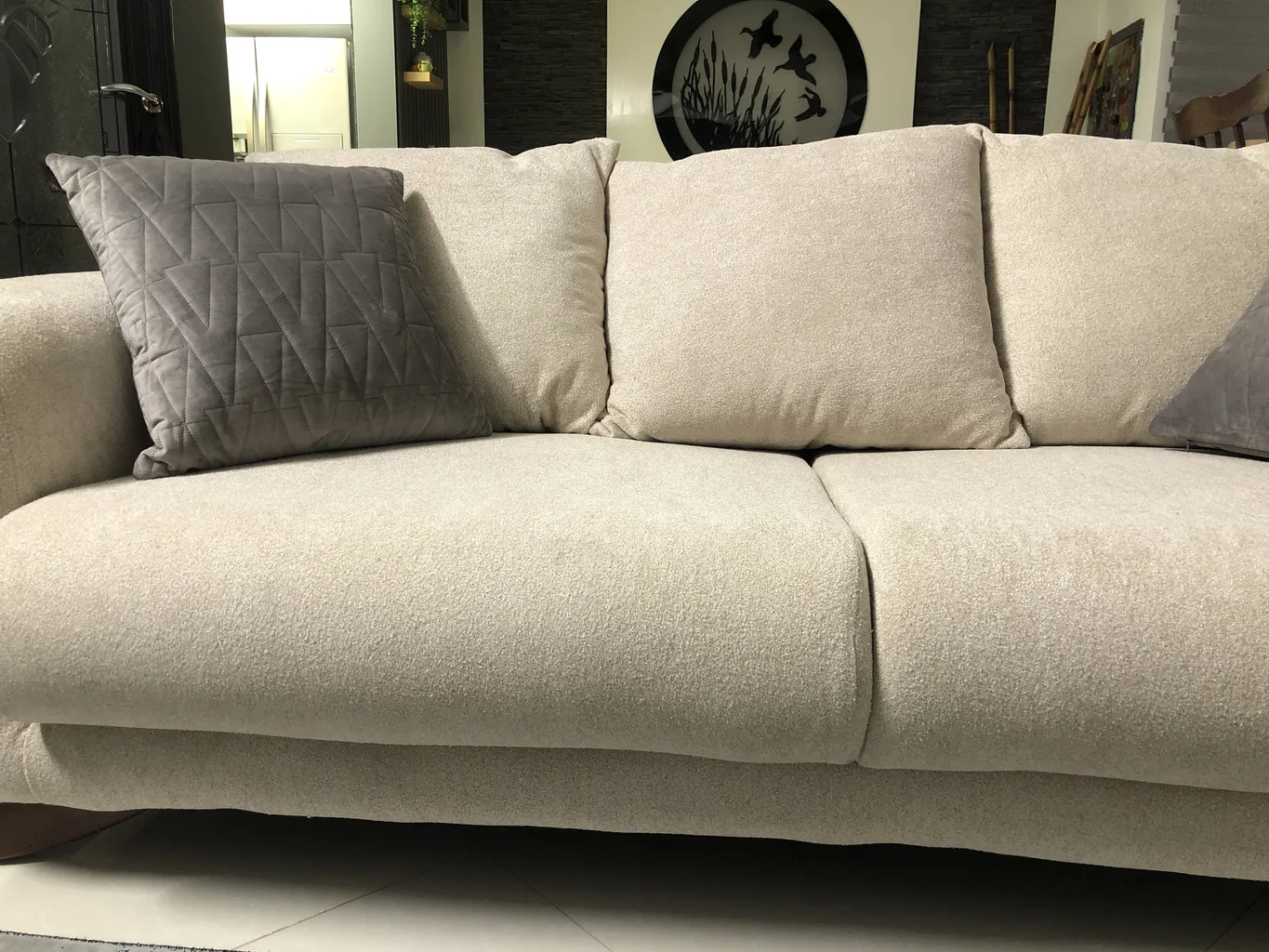 - ⬤ جنس پارچه : پارچه مبل باید با کیفیت و مقاوم در برابر سایش باشد. خریداران از پارچههای بیکیفیت و زود خراب شونده ناراضی هستند و به دوام پارچه توجه میکنند. پارچههای با بافت مناسب و قابل شستشو معمولاً محبوبتر هستند و میتوانند به راحتی تمیز شوند.