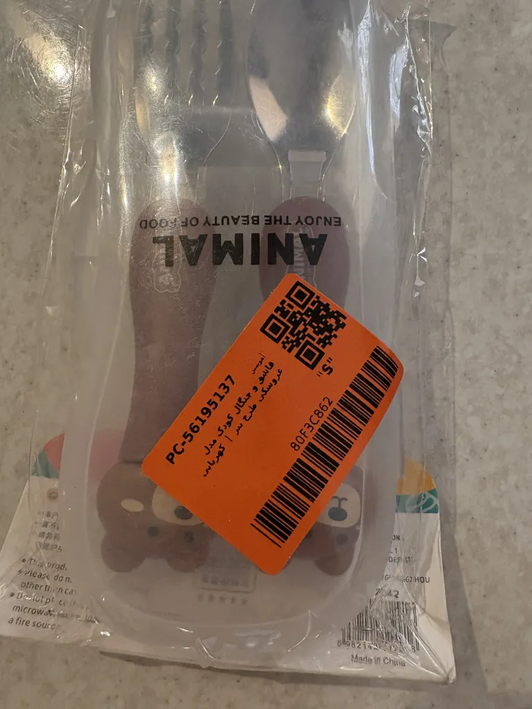 روی بسته قاشق چنگالی که فرستادن نوشته طرح ببر مدل که بایی ولی توش خرس قهوه ایه