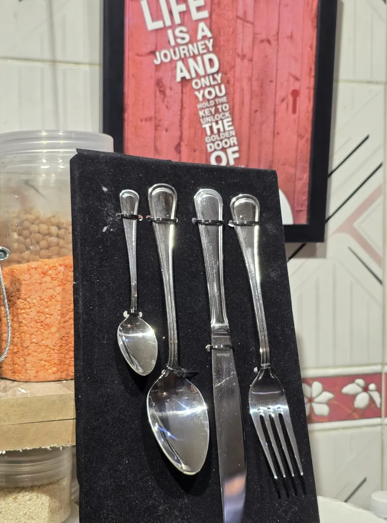 - ⬤ سرویس قاشق و چنگال 8 پارچه : این سرویس شامل 4 عدد قاشق و 4 عدد چنگال است که برای خانوادههای کوچک مناسب میباشد. خریداران به زیبایی و طراحی شیک این سرویس اشاره کردهاند، اما برخی از آنها از نازکی و عدم استحکام قاشقها و چنگالها شکایت کردهاند.
