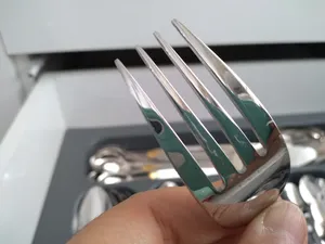 - ⬤ مقاومت در برابر خش : قاشق و چنگال باید در برابر خش مقاوم باشند. خریداران به زود خش افتادن برخی مدلها اشاره کردهاند و گفتهاند که این موضوع باعث میشود که ظاهر سرویس به سرعت خراب شود. برخی از خریداران از مدلهایی که به راحتی دچار خط و خش میشوند، شکایت کردهاند و گفتهاند که این موضوع باعث میشود که آنها نتوانند از سرویس در مهمانیها استفاده کنند.