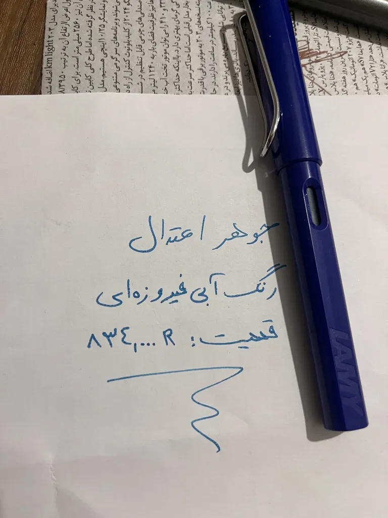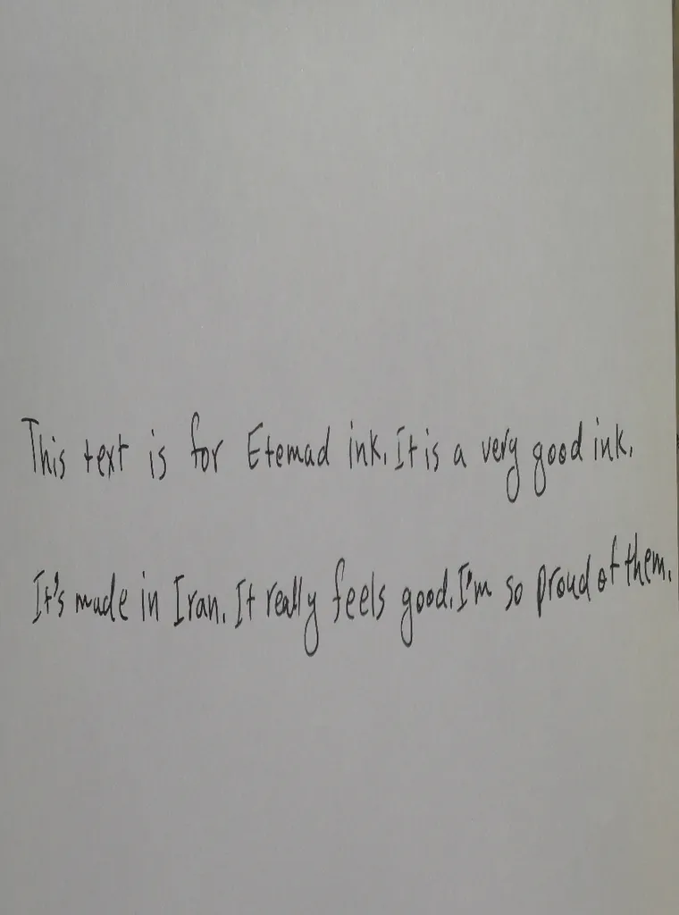هادی سبحانی : کیفیت خیلی خوب ؛ من قبلاً از تولیدات سال های قبل این محصول استفاده کردم. وقتی این رنگهای آبی و مشکی رو اینجا خریدم، واقعاً کیفیتی مناسبی داشت و به لحاظ کیفی رشد قابل توجهی رو داشته و به راحتی با محصولات مشابه خارجی رقابت می کنه. بسته بندی های جدیدی هم استفاده شده که متفاوت از تصاویر در سایت هست. نمونه نوشته با این جوهر ها رو توی عکس قرار دادم. امیدوارم که این اطلاعات برای دیگران مفید باشه