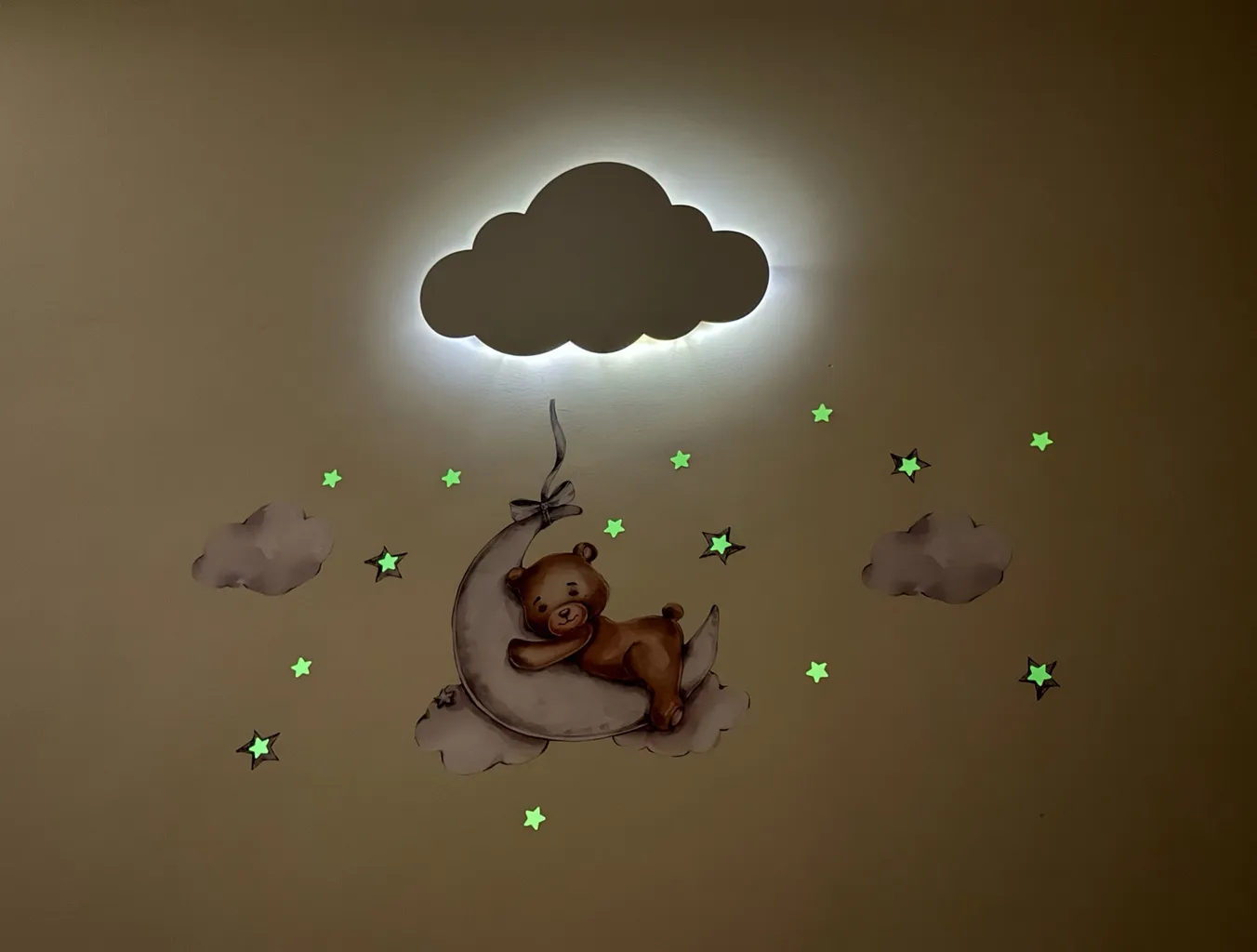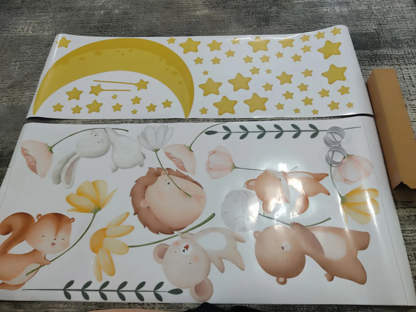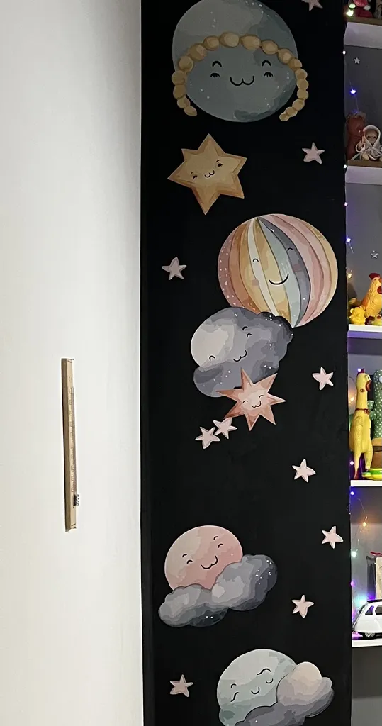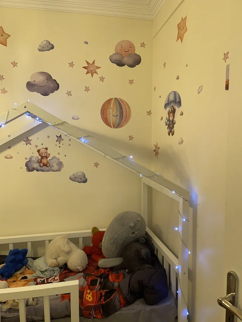 عالی،عین تصویر. نصب راحت. ب پیشنهاد بچه م به سقف،بالای سرش چسبوندم،خیلی ناز شده. خودت میتونی ستاره ها و ابر هارو با فاصله بیشتر یا کمتر بچسبونی، سلیقه ای هست