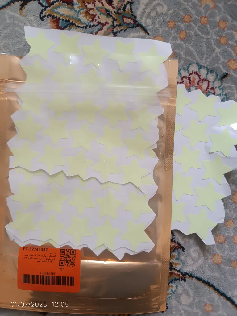 علیرضا صالح : سلام.من چهار بسته خریدم خوب شد عکسشو گذاشتم.برای اتاق خواب پسرم زدم .پیشنهاد میکنم به سقف بزنین یا جای که نور چراغ بیفته روش تا وقتی شب چراغ خاموش میکنین نورش بیشتر باشه .سایز 1*1 هم ستارش 3 سانت متر مربع هست ممنون از دیجی کالا
