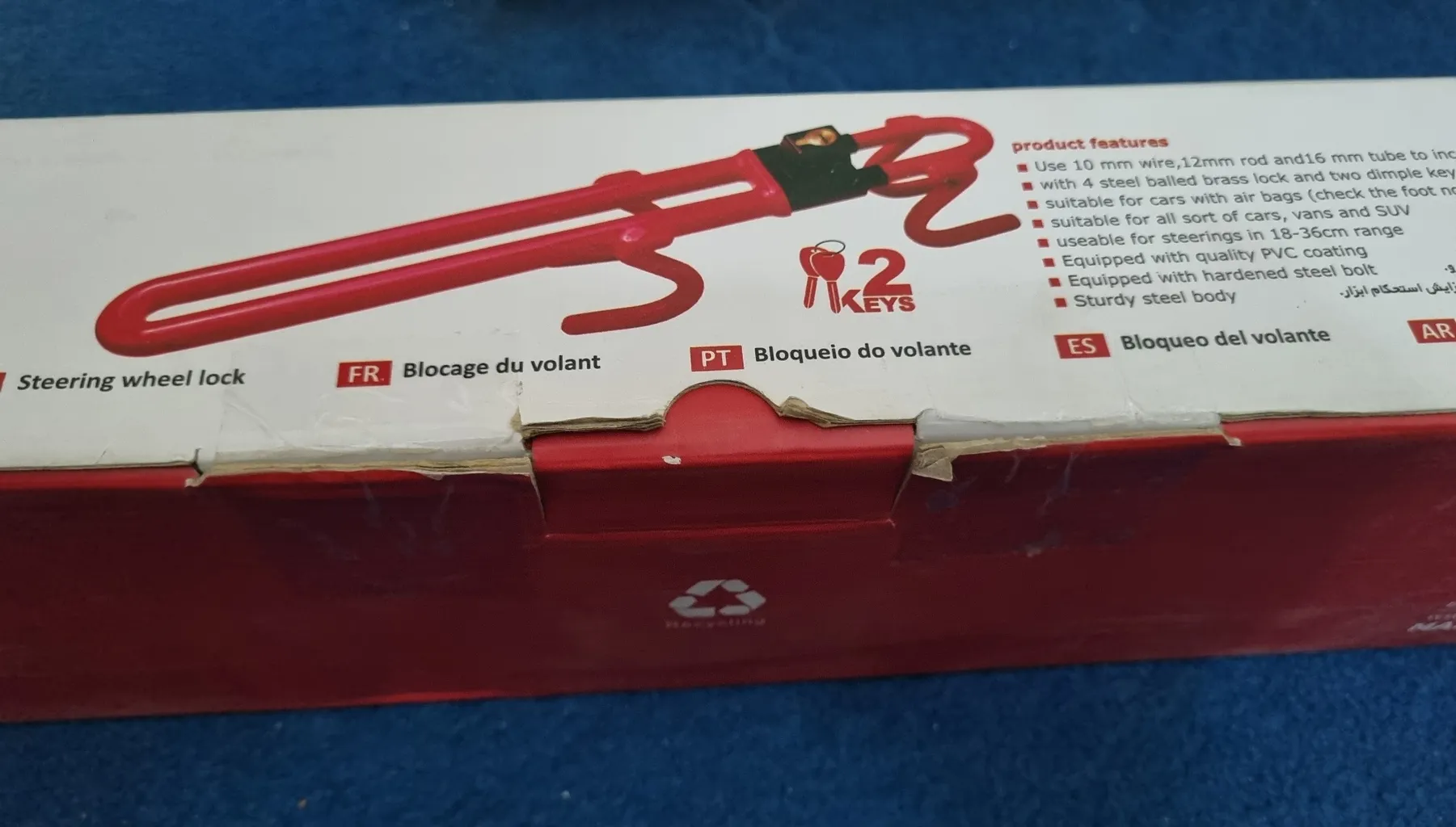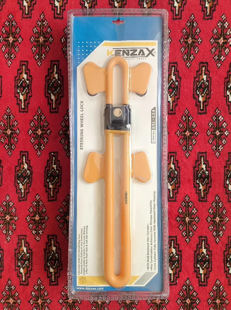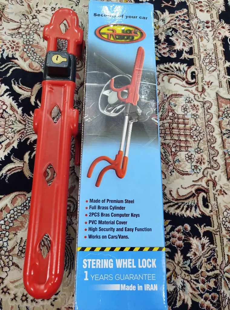 کالای کپیه اصل این محصول برندیه به نام Tevlaphee از جنس فولاد ضد برش .. که با نام Tevlaphee Steering Wheel Clamp with Combination Lock میتونید جستجوش کنید کیفیت ساختش پایینه و چاپ و غالب گیری کر کثیفه ، ولی سنگین و جون داره ، پروسه باز کردم و تعویض رمز برای بار اول خیلی سخته و واقعا مصببته . پیش گوشتی و آچار ام که تو عکس مشخصه همراهش نبود ، ولی با این حال چون فروشنده خیلی وقت گذاشت برا راهنمایی دلم نیومد مرجوع کنم ، اگه گیرپاج نکنه در آینده تضمین امنیتش هزاره