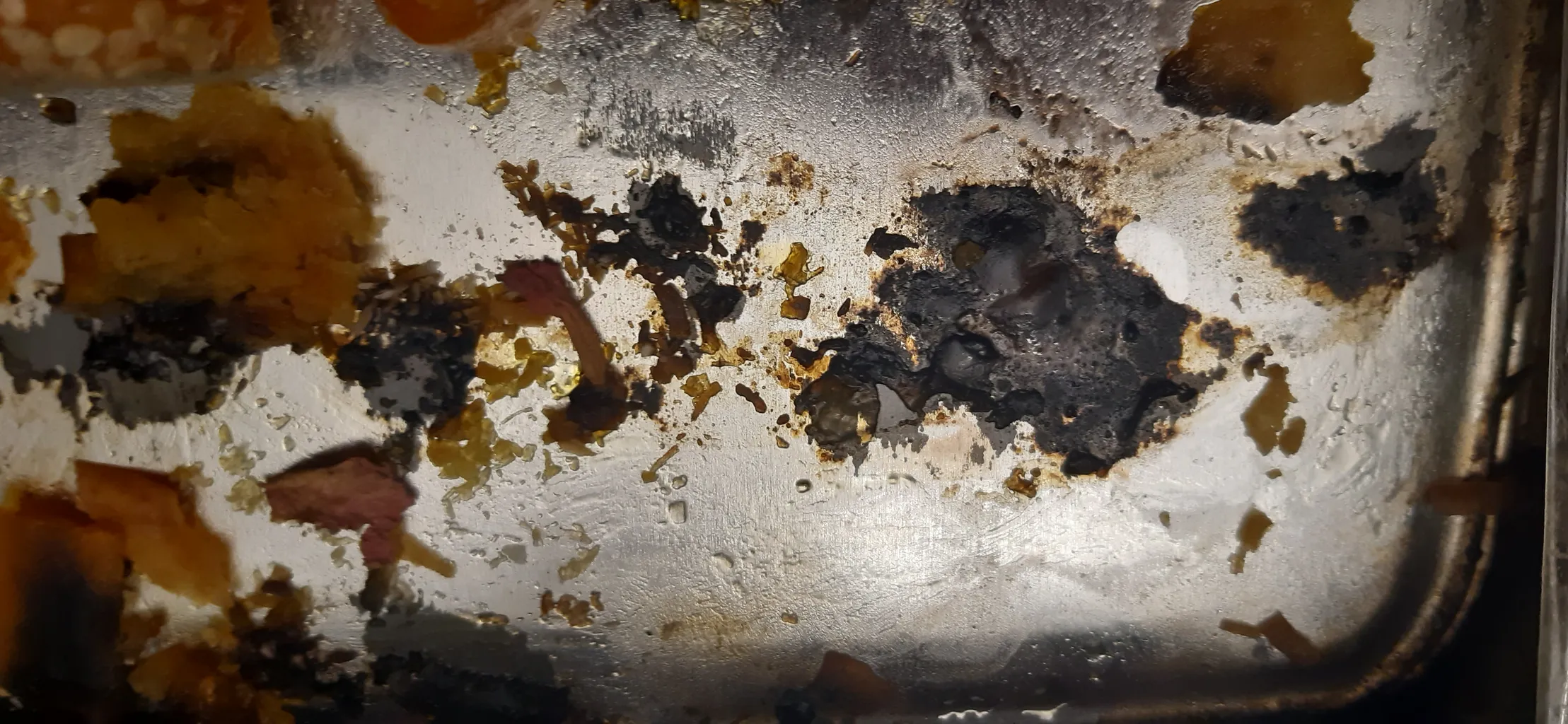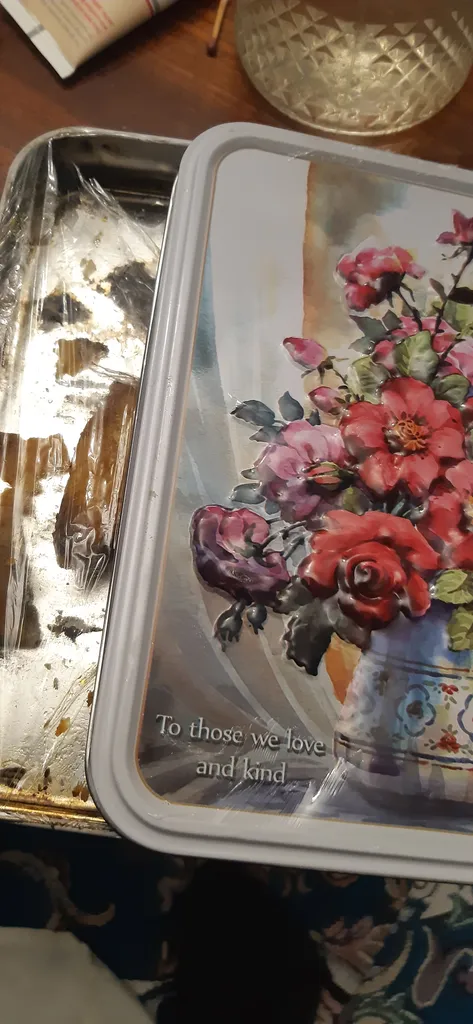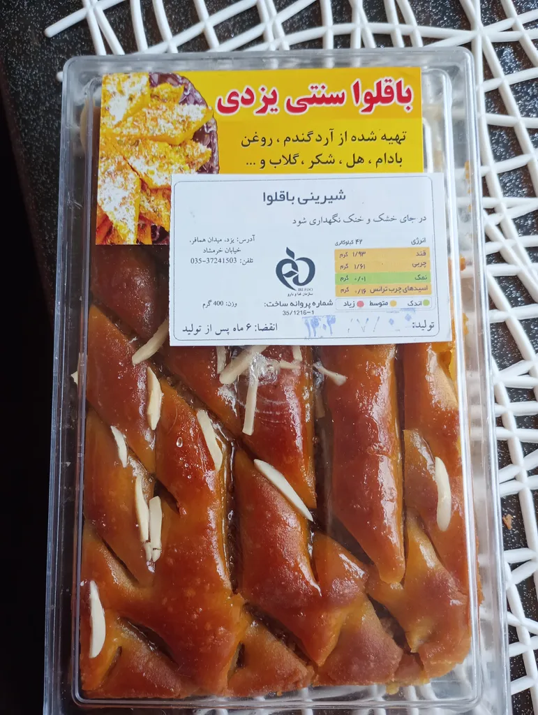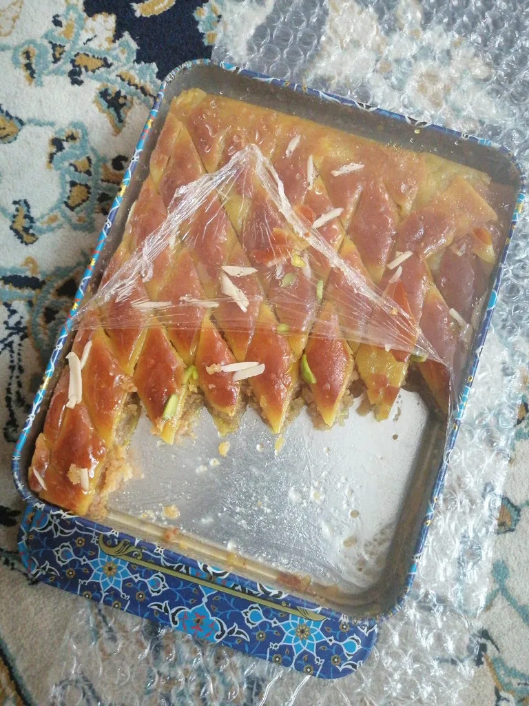 سلام متاسفانه باید بگم ظرف حلبی که این باقلوا در آن چیده شده بسیار غیر بهداشتی است و باعث کپک زدن شیرینی میشود.حیف این همه زحمت قناد است.قسمتهای سیاه ظرف را میبینید از حلب ظرف است