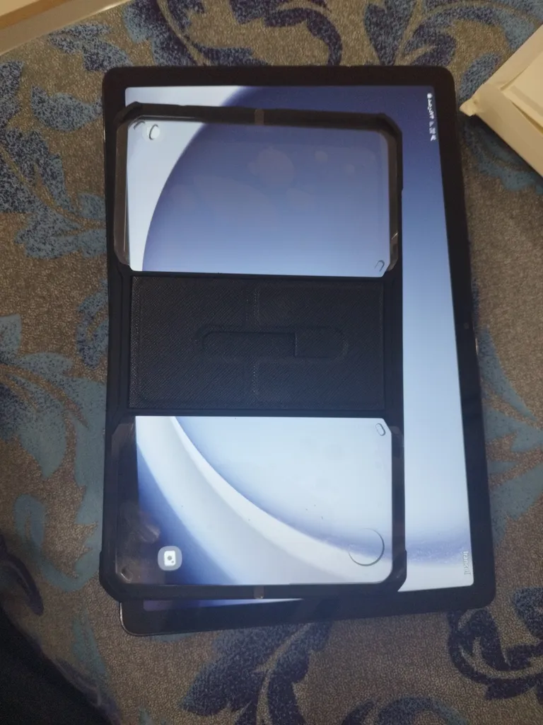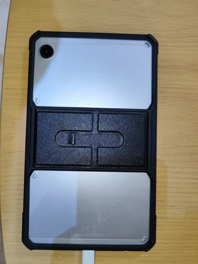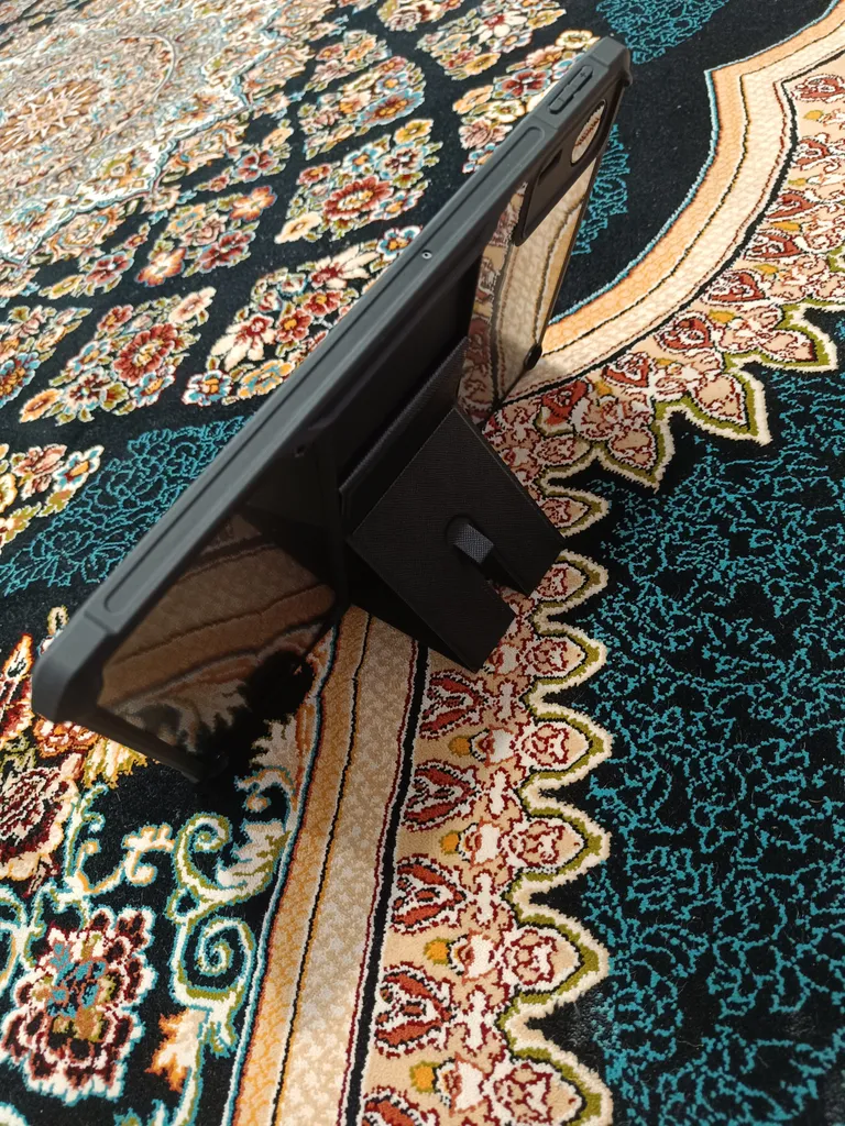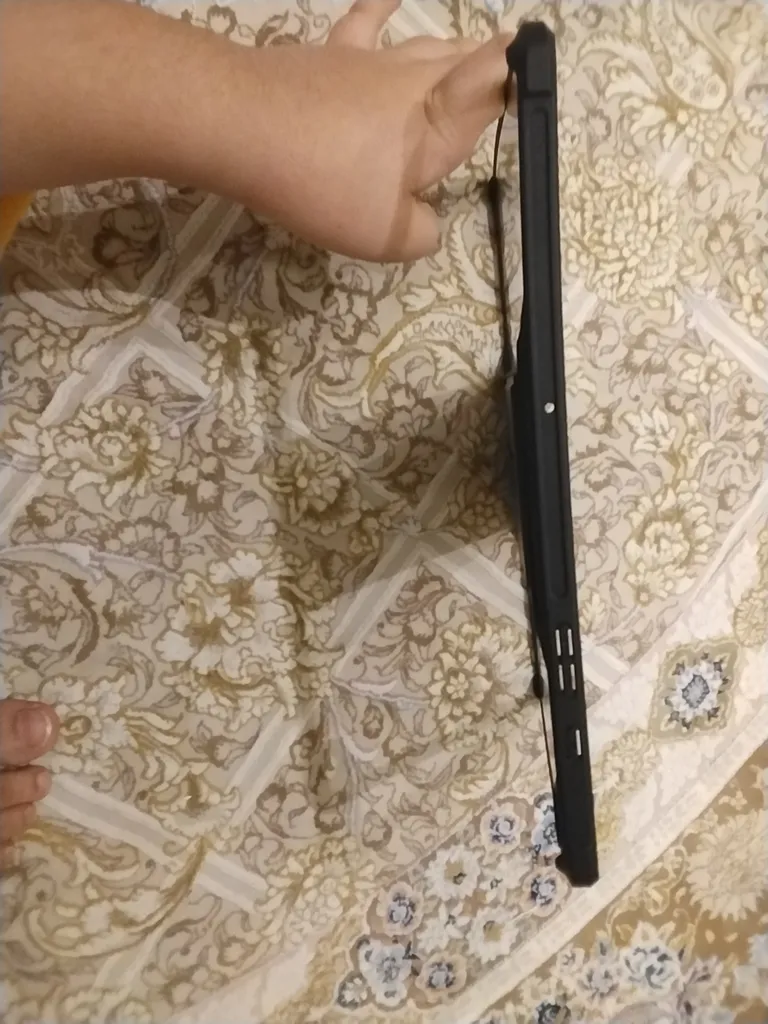 حالا اگه بخوام به صورت کلی راجع به مزایا و معایبش بگم، دور و بر تبلت رو پوشش میده و حاشیه اش برآمدگی جزئی هم داره که اگه تبلت رو از طرف صفحه نمایشش روی سطحی قرار بدید، ۲-۳ میلی متری از سطح فاصله پیدا میکنه. قسمت دوربینشم به همین صورته. دسترسی به پورت و دکمه ها و حسگر اثر انگشت راحت و بدون مشکله. من قلم تهیه نکردم ولی فرورفتگی مربوط به قلم هم داره. وزنشم نکردم ولی به نظرم نمیشه گفت سنگینه. تنها ایرادی که من بهش می گیرم اینه که از ۴ ضلع تبلت، دو ضلعش کاملا لبه متصل به صفحه نمایش تبلت رو نپوشونده ولی حقیقتش چیز مهمی نیست، یا حداقل برای من مهم نیست. صرفا از لحاظ بصری یک مقدار مشکل ایجاد میکنه، از لحاظ محافظت نه