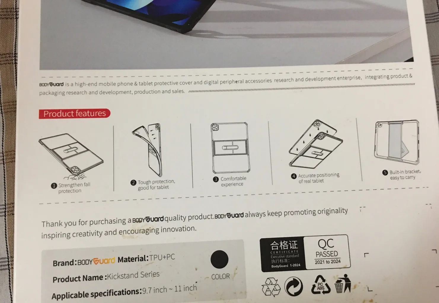 غیر استاندارد و نامناسب ؛ برندش که اصلا بادیگارد نبود و روی جعبه جز برچسب دیجیکالا چیزی نداشت. روی نایلون داخل (عکسش هم آپلود کردم) برند XUNDO زده بود.وزنش ۱۷۷ گرم بود. یعنی حدود ۲۰% از وزنی که در مشخصات نوشته و در تصاویر آمده بیشتر بود! من هم آنقدر کامنتها در مورد این کاور مثبت بود که گول خوردم و قبل از اولین روشن کردن تبلت، از کاور استفاده کردم. تبلت بیچاره هی می خواست روشن بشه، دوباره ری استارت می شد و بیش از ده بار اینجور شد و من به جای اینکه ایراد را از کاور غیر استاندارد و بنجل ببینم فکر کردم مشکل از تبلت هست. فقط برای لحظه ای آن قسمت از کاور که سمت کلید پاور بود را با دست آزاد کردم و همه چیز عادی شد و تبلت آمد در صفحه ست آپ اولیه. باز هم فکر کردم شاید تبلت خوب در کاور جا نخورده و کلی ور رفتم و نشد که نشد. حوصله مرجوعی نداشتم چون به تبلت نیاز داشتم و استفاده ی بدون کاور برام سخت بود. و همون کاری را کردم که در عکس معلومه. قسمت کلید پاور را بریدم!! اصلا از قرار گرفتن لنز دوربین و اون نوشته 8.0 مگاپیکسل معلومه که سایزبندی کاور استاندارد نیست!
