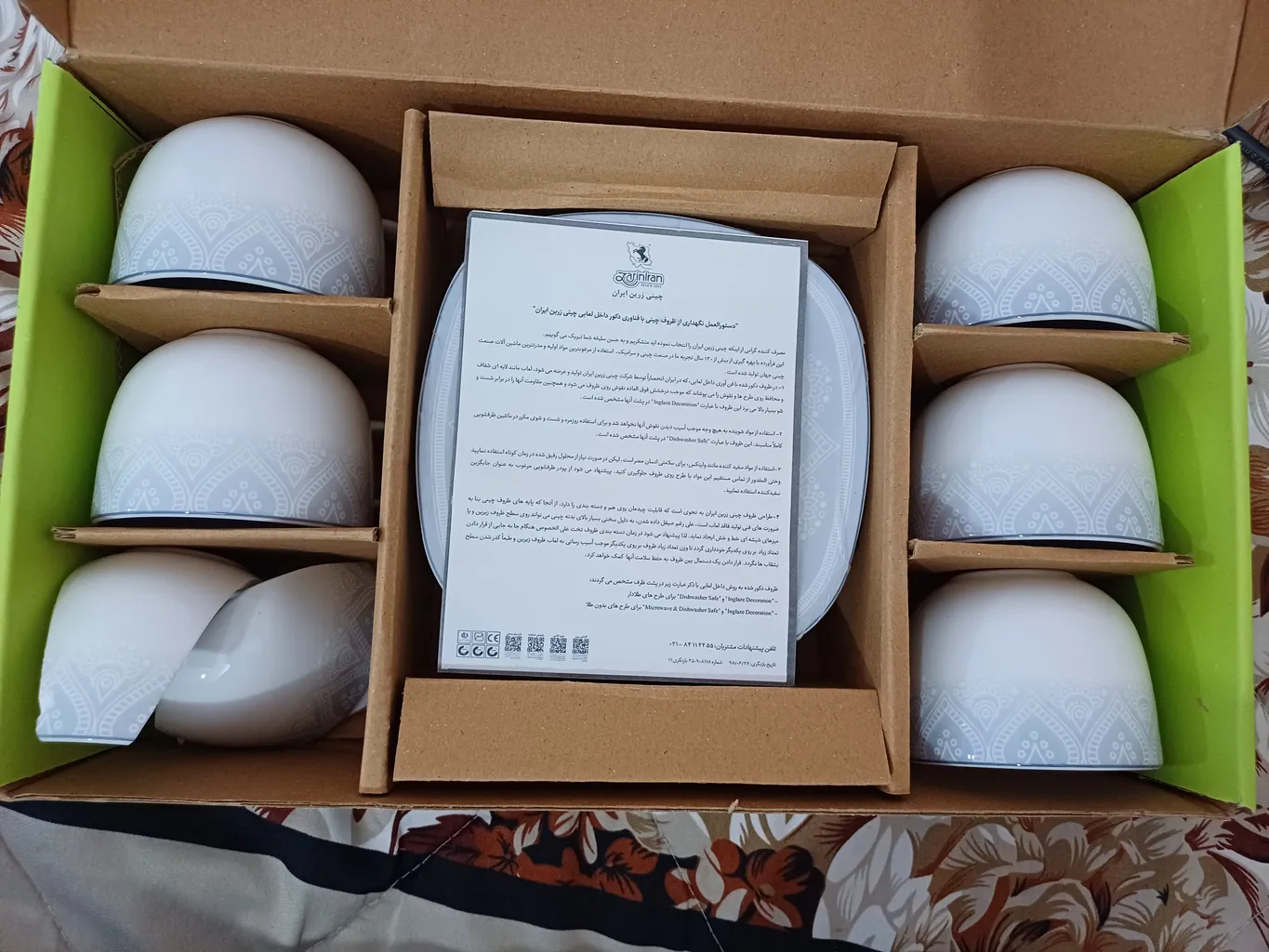 چند روز پیش هم سرویس غذا خوریش رو خریده بودم که خداروشکر سالم به دستم رسید و از کیفیتشون راضی بودم که تصمیم گرفتم فنجان نعلبکی و قندان هم بخرم که از این خرید هم راضی هستم.مهر پشتش هم سبز بود یعنی درجه یک
