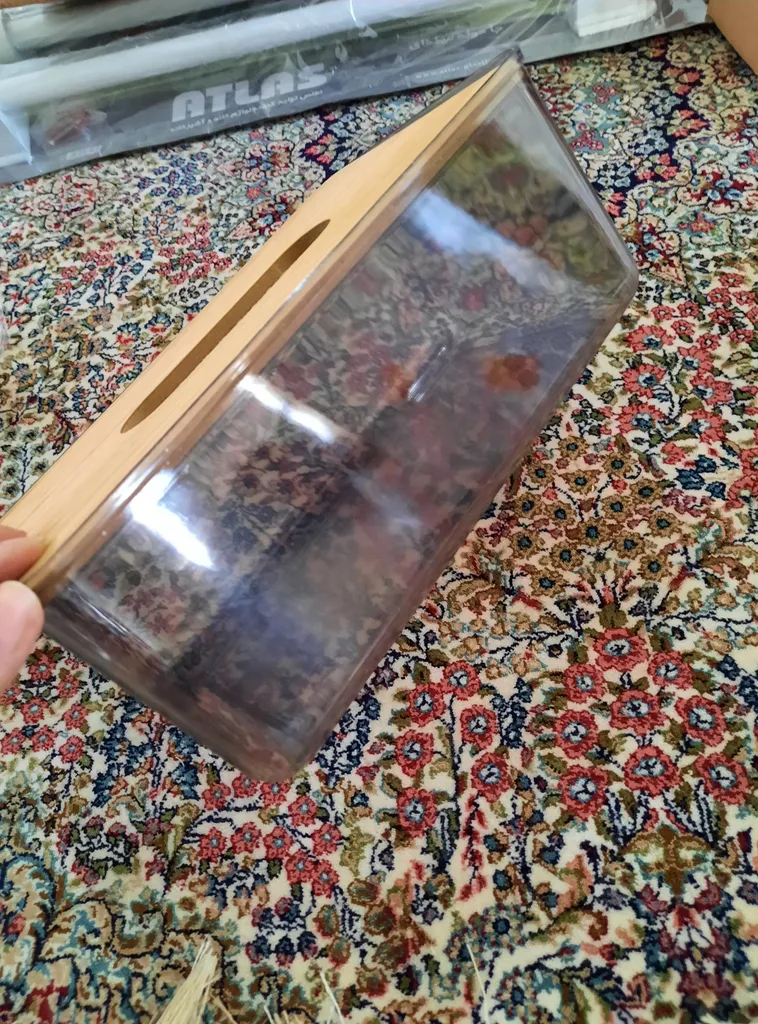 خریدار بدون نام : کار زیبایی هست اما اصلا شفاف نیست، پر از حباب و نا خالصی، لبه های کار صیقل نشده، دستمال زبادی توش جا نمیشه، در کل توصیه نمیکنم واقعا
