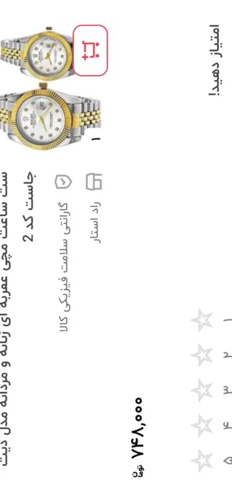 - ⬤ قیمت مناسب کالاهای ایرانی : یکی از مزایای بارز ست ساعتهای زنانه و مردانه ایرانی، قیمت مناسب آنهاست. خریداران به وضوح بیان کردهاند که این ساعتها با توجه به کیفیت و طراحی، قیمتهای بسیار مناسبی دارند و این موضوع باعث میشود که خرید آنها برای عموم مردم امکانپذیر باشد. بهعنوان مثال، قیمت برخی از مدلها بهطور متوسط بین 300 تا 800 هزار تومان متغیر است که با توجه به ویژگیهای فنی مانند ضد آب بودن و وجود موتورهای با کیفیت، ارزش خرید بالایی دارد.