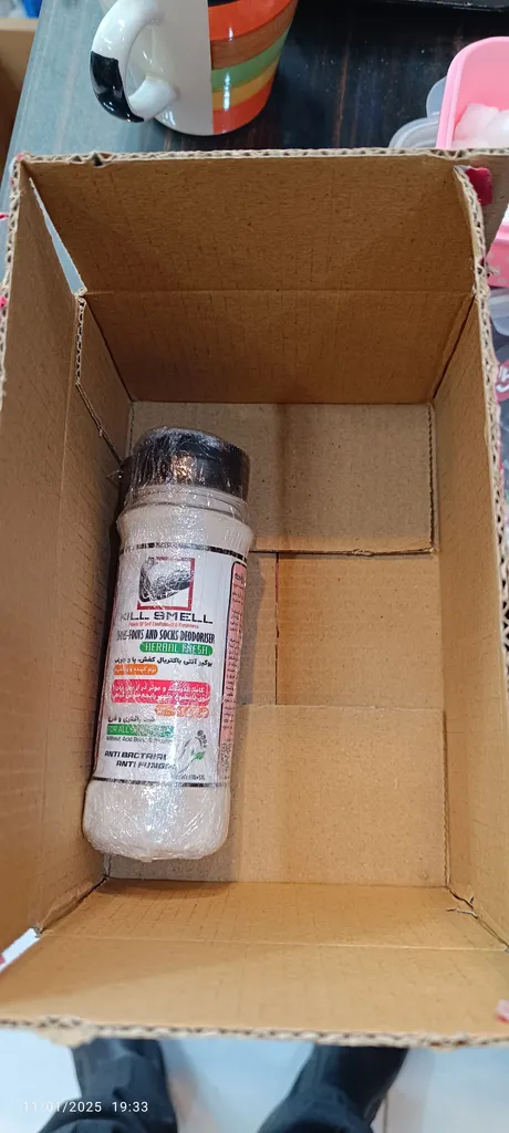 علی رحیمی : مطابق عکسی که که گذاشته شده نیست ولی بوی پا رو توی کفش میگیره البته برای یک بار که پودر رو داخل کفش یا کتونی میریزید میتونید سه دفعه که میپوشید جواب میده
