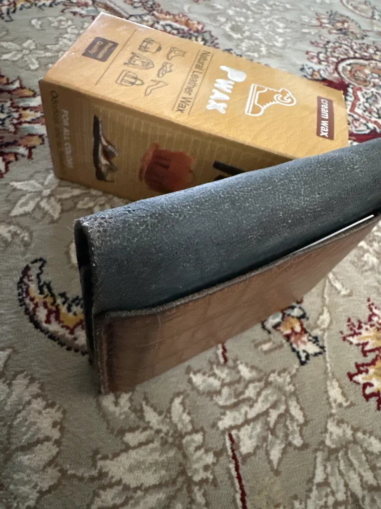 بعد این واکس رو تویه سه لایه بسیار نازک زدم با فاصله برای خشک شدن(تو واکس زیاده روی نکنید) قشنگ جذبش شد و اون رنگ چرم برگشت