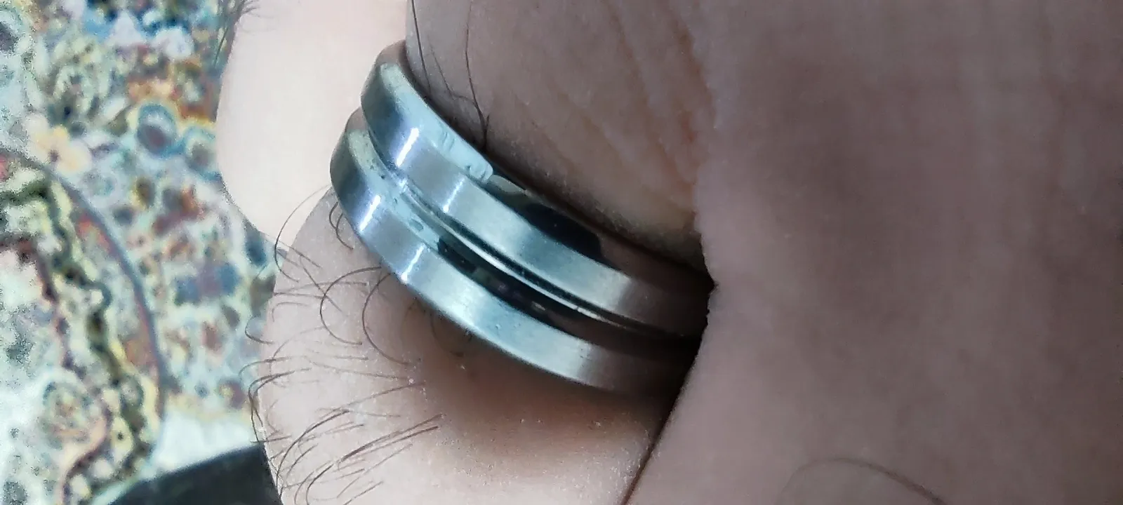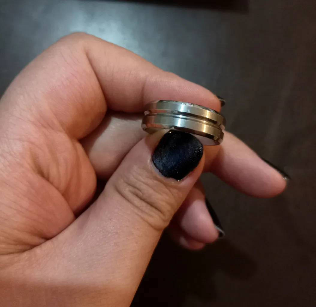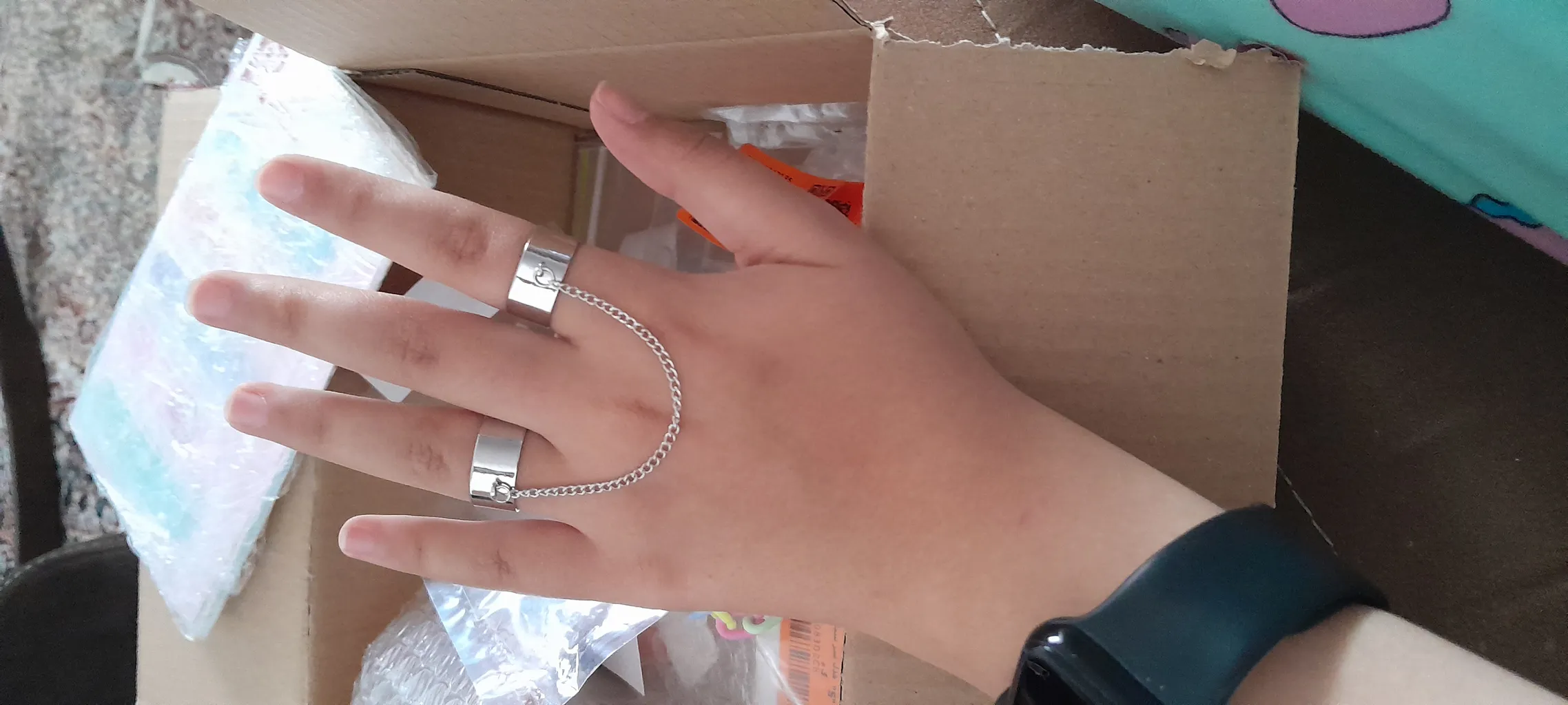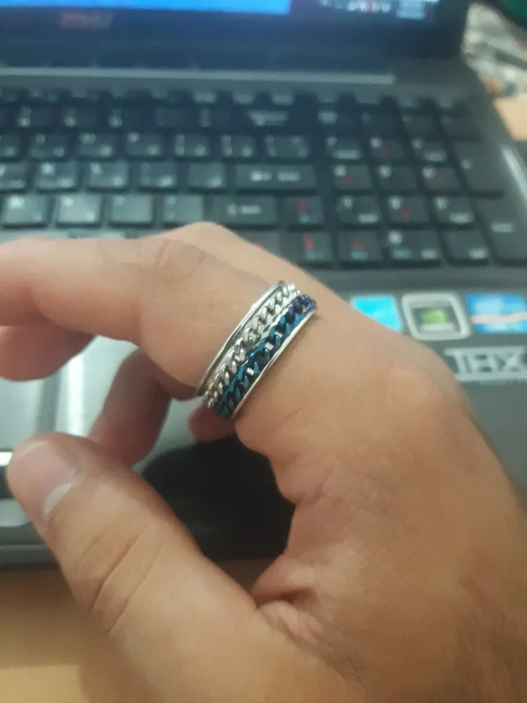 چیز باحالیه، هرچند من سایز 12 برای انگشت انگشتریم سفارش دادم ولی چیزی که فرستادن قطرش 21.3 هست که یعنی سایز 13 که به انگشت های وسط، اشاره و شستم می خوره، البته اگر بخواید با زنجیرش بازی کنید بهتره به یکی از همین سه تا انگشت بندازید. دو تا زنجیر از هم جدا هستن و مستقل حرکت می کنن. چرخششون باحاله ولی مثل اسپینر معمولی نیست که یه ساعت بچرخه، دو دور میزنه و می ایسته. یک مچ بند کشی هم تو بسته بود