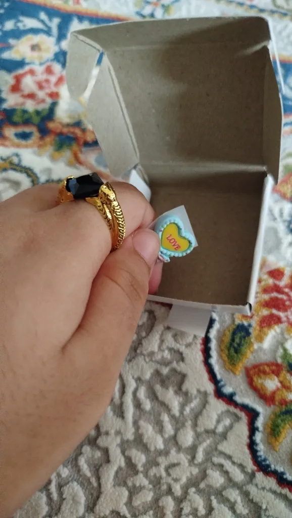 انگشتر خوبیه ولی متأسفانه من سایز اشتباه رو انتخاب کردم، یکم برام بزرگه. در کل انگشتر جالبیه ، رنگ شب تابش زرد لیمویی هست.