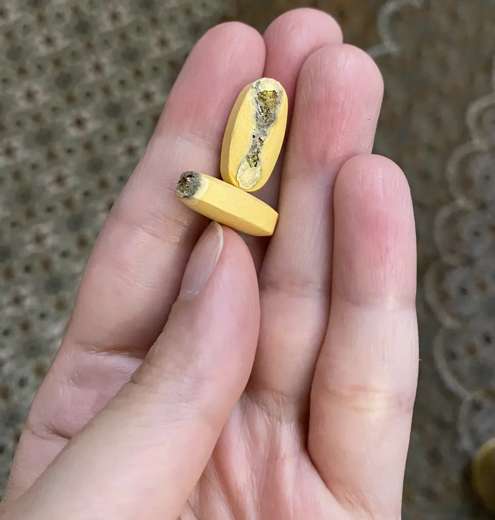 من دو قوطی سفارش داده بودم و یک قوطی قرص کاملا سالم بود ولی در قوطی دیگر دوتا قرص خراب بود که به دیواره قوطی چسبیده بودن که عکسش رو میزارم و امیدوارم بقیه قرص های اون قوطی سالم باشن