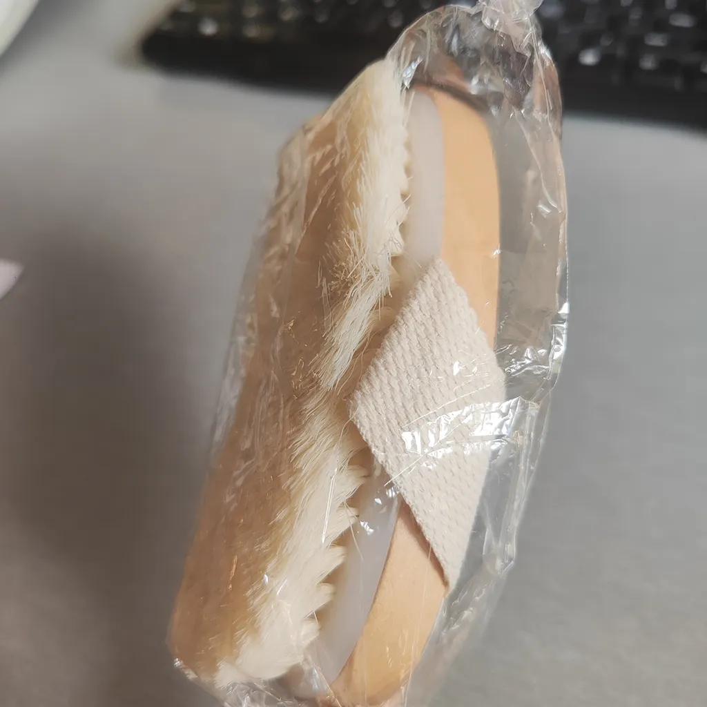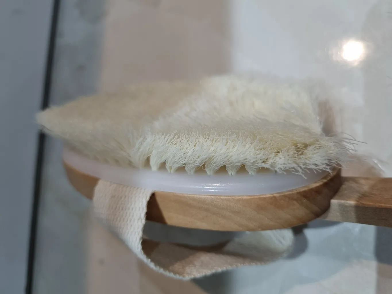 برس الیاف طبیعی نیست و خیلی زبر هست و احساس بدی موقع کشیده شدن روی پوست ایجاد میکنه حتی حس میکنی داره پوستو خراش میده قسمت زیر موهای برس هم از جنس پلاستیک سخت هست و چوبی نیست