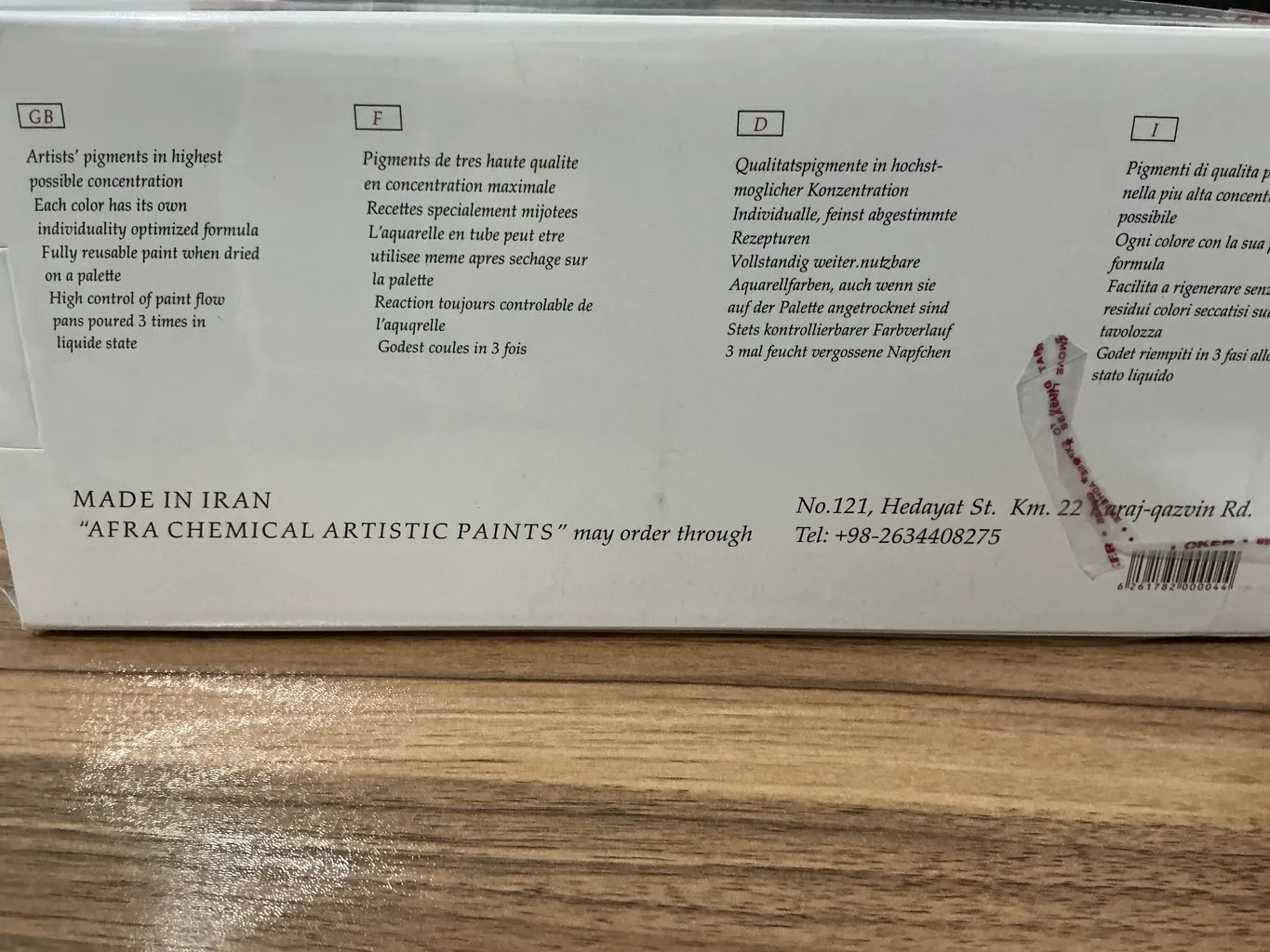 خریدار بدون نام : خوب و محکم بسته بندی شده ولی نمیدونم چرا قرص هاش همه ترک داره و جای پالتش رنگیه یه کم! درشم خیلی سخت باز میشه. تعریف این آبرنگ رو از دوستم شنیده بودم ولی فعلا کار حرفه ای باهاش نزدم و اینکه قرص هاش ترک ترکه خورد تو ذوقم عکسشو میزارم ببینید